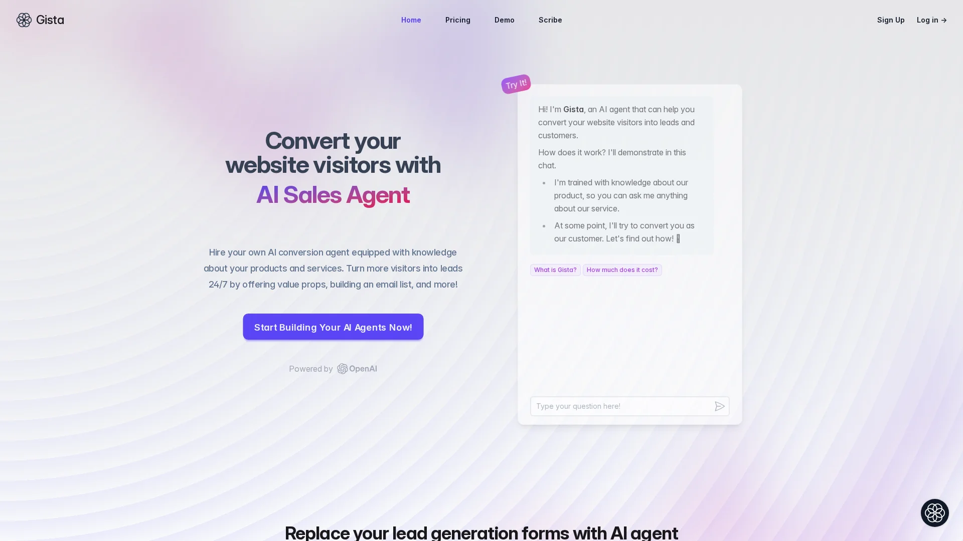About Gista : text: Meet Gista Gista, an AI Conversion Agent that transforms website visitors into leads 24/7. Leveraging AI-powered sales agents, our platform bridges the gap between human-like interactions and automation, enhancing decision-making capabilities.
