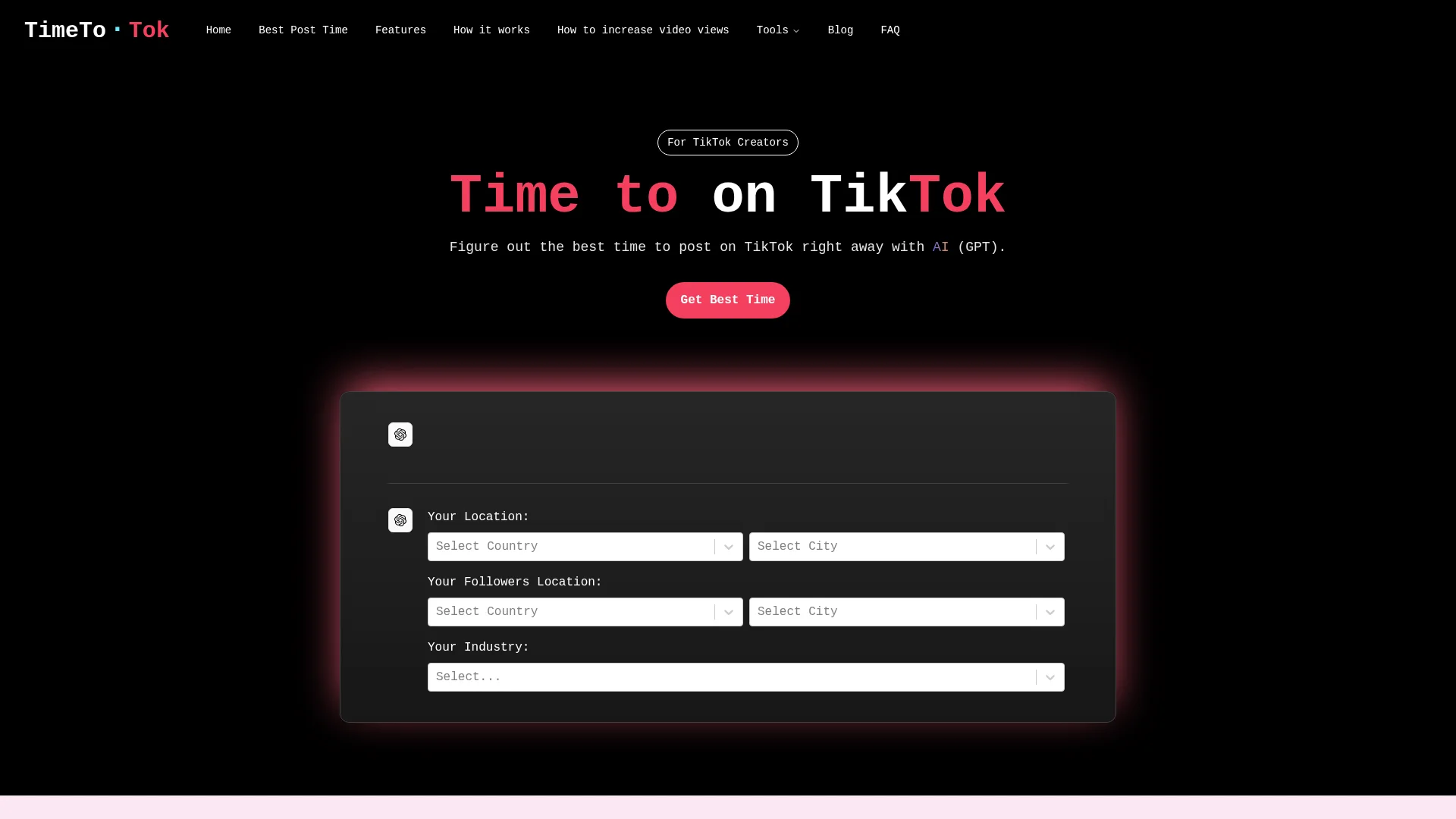 About Timetotok : TimeToTok is an AI CoPilot and Agent designed for TikTok creators. Our purpose is to assist with optimal TikTok posting schedules, thereby maximizing engagement and reach.tagline: