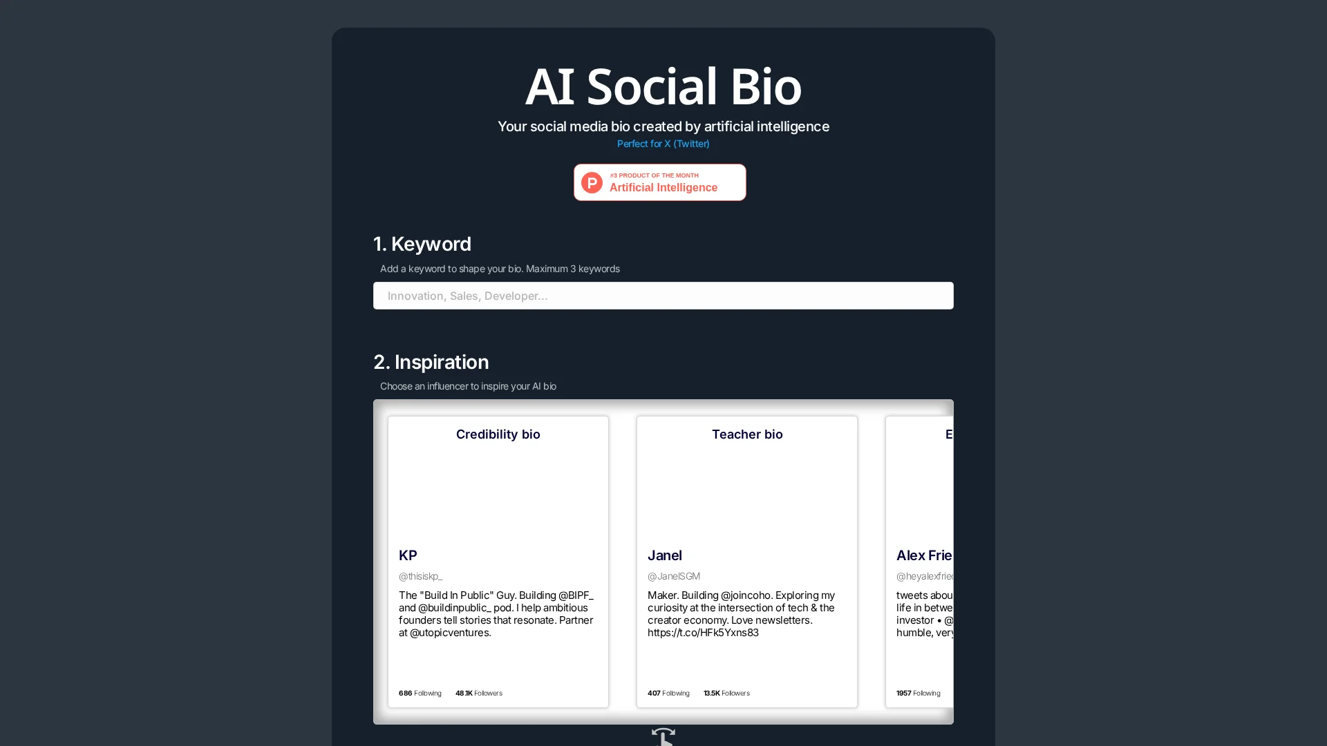 Create the perfect social media bio using AI. Use the AI Social Bio generator to get the best Twitter, LinkedIn and Instagram bio.