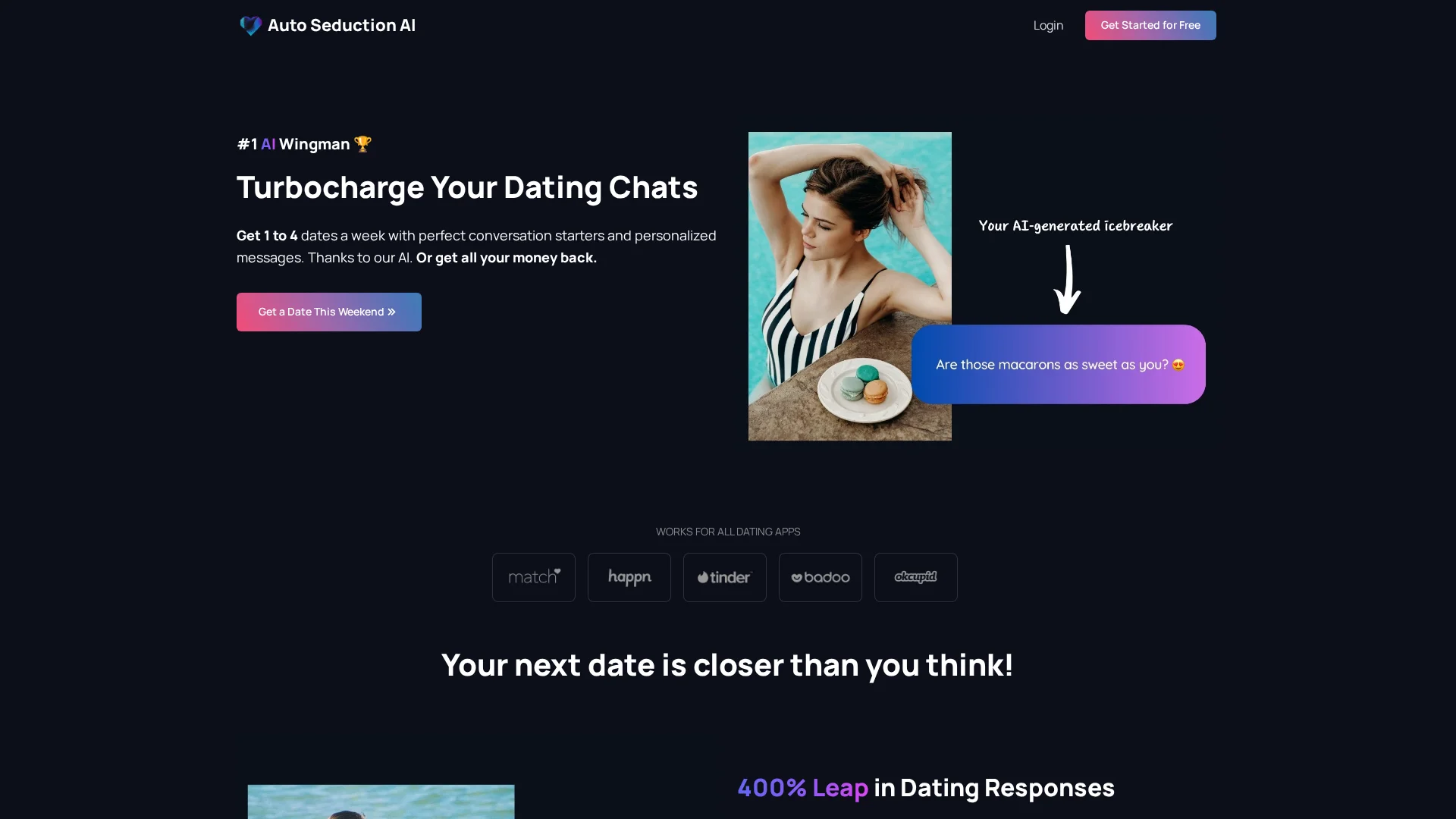 About Auto Seduction Ai : Auto Seduction AI is an AI-powered tool that automates online dating by generating personalized messages. It helps users to efficiently manage their dating profiles and increase their chances of getting responses.