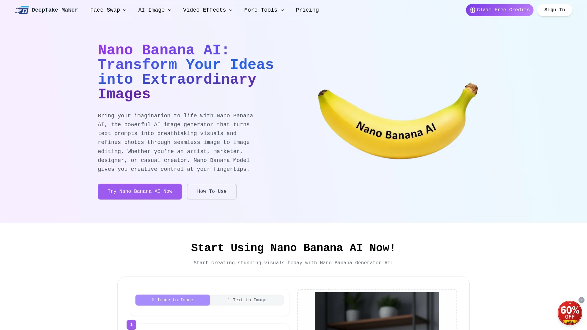 About Deepfake Maker Nano Banana : The Nano Banana AI is a comprehensive AI image generator and editor. It enables users to create stunning visuals through text-to-image and image-to-image editing capabilities.