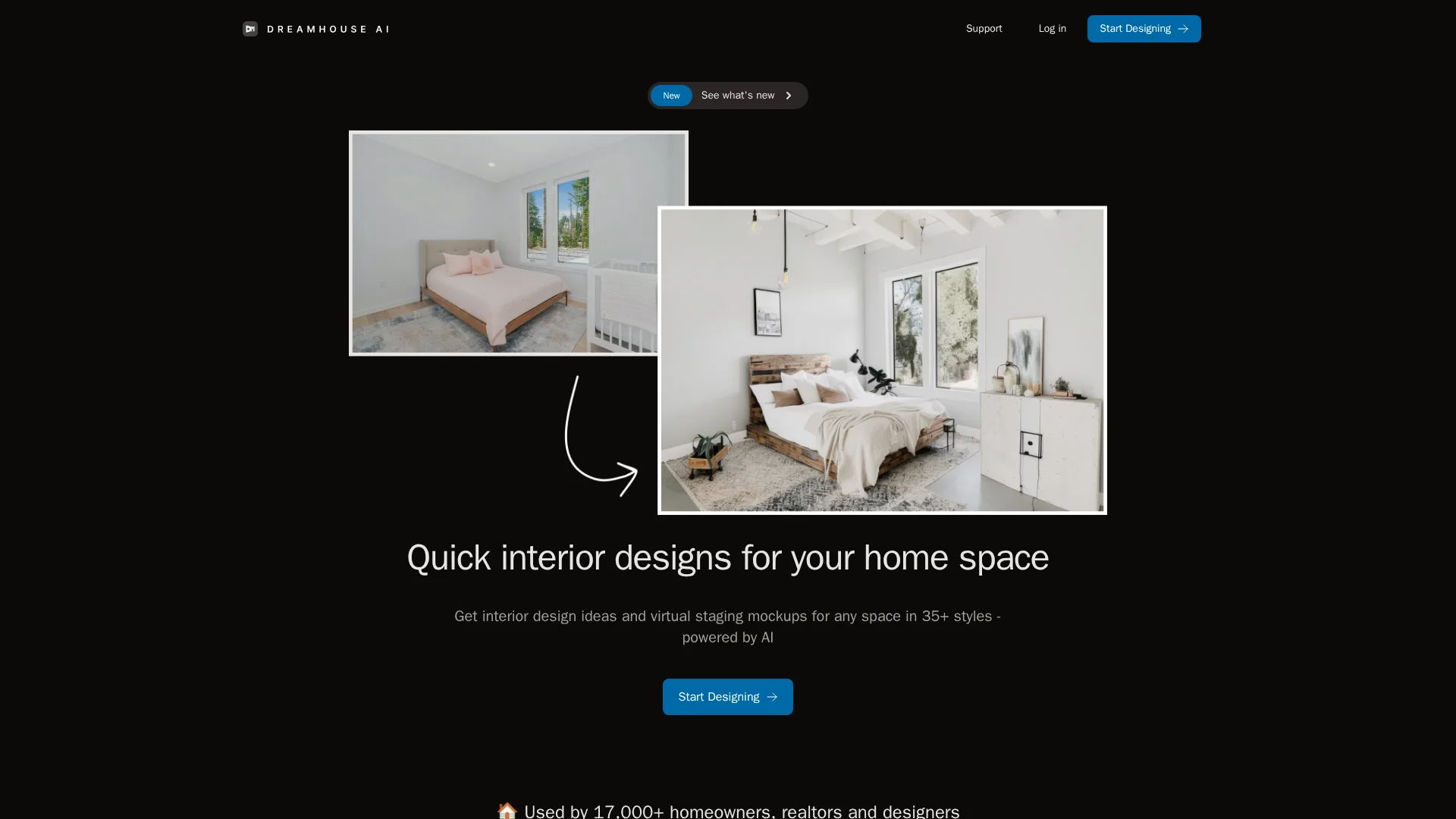 About Dreamhouse Ai : text: DreamHouse AI revolutionizes home interior and exterior design with AI-powered tools. Upload a photo and explore 20+ design styles, before-and-after comparisons, and product recommendations.