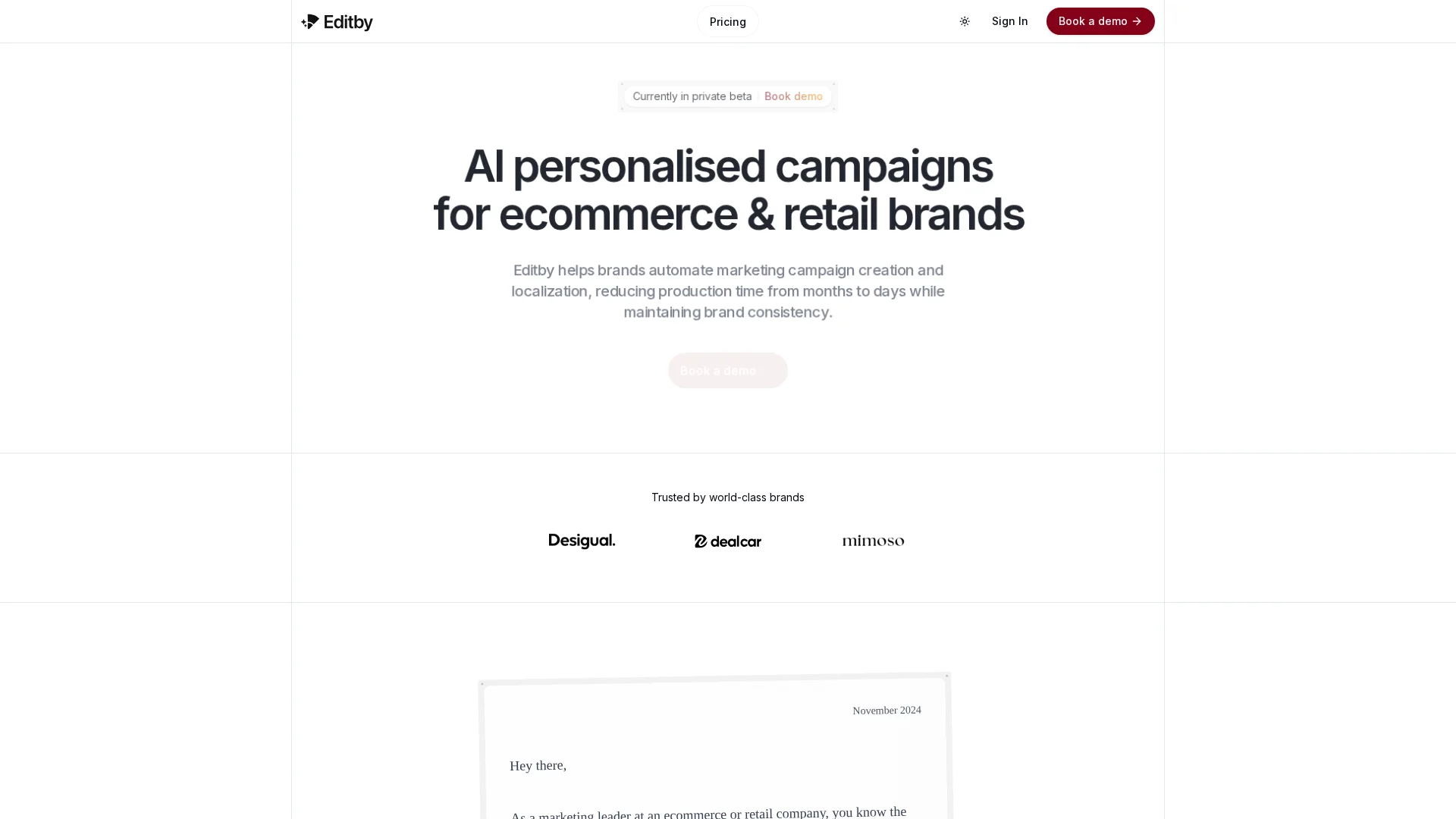 About Editby : Editby empowers ecommerce and retail brands to create and localize AI-powered marketing campaigns tailored to diverse audiences. Our cutting-edge platform expedites brand consistency, minimizes campaign creation time from months to mere days.