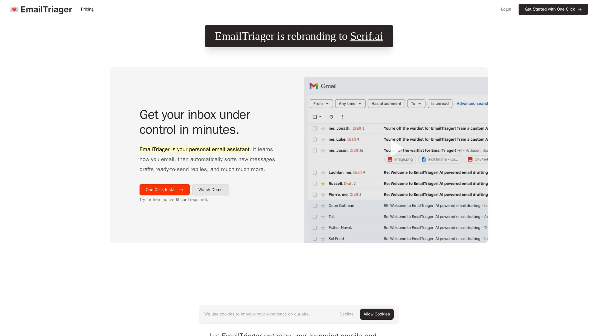 EmailTriager is an AI assistant that automatically organizes your incoming emails and drafts ready to send replies in the background. Get started with one click.