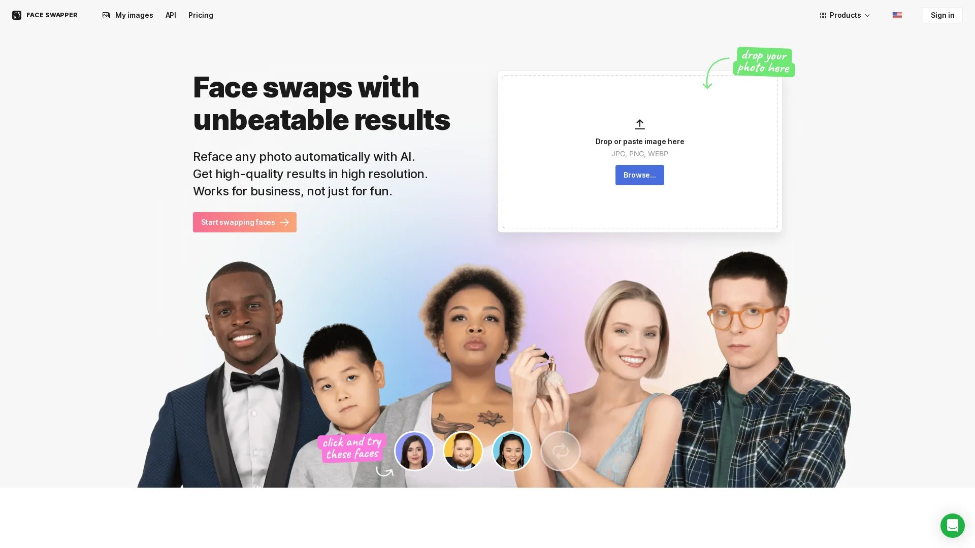 Swap multiple faces online without reducing image quality. Change faces and create new models for your project using AI technology for free.