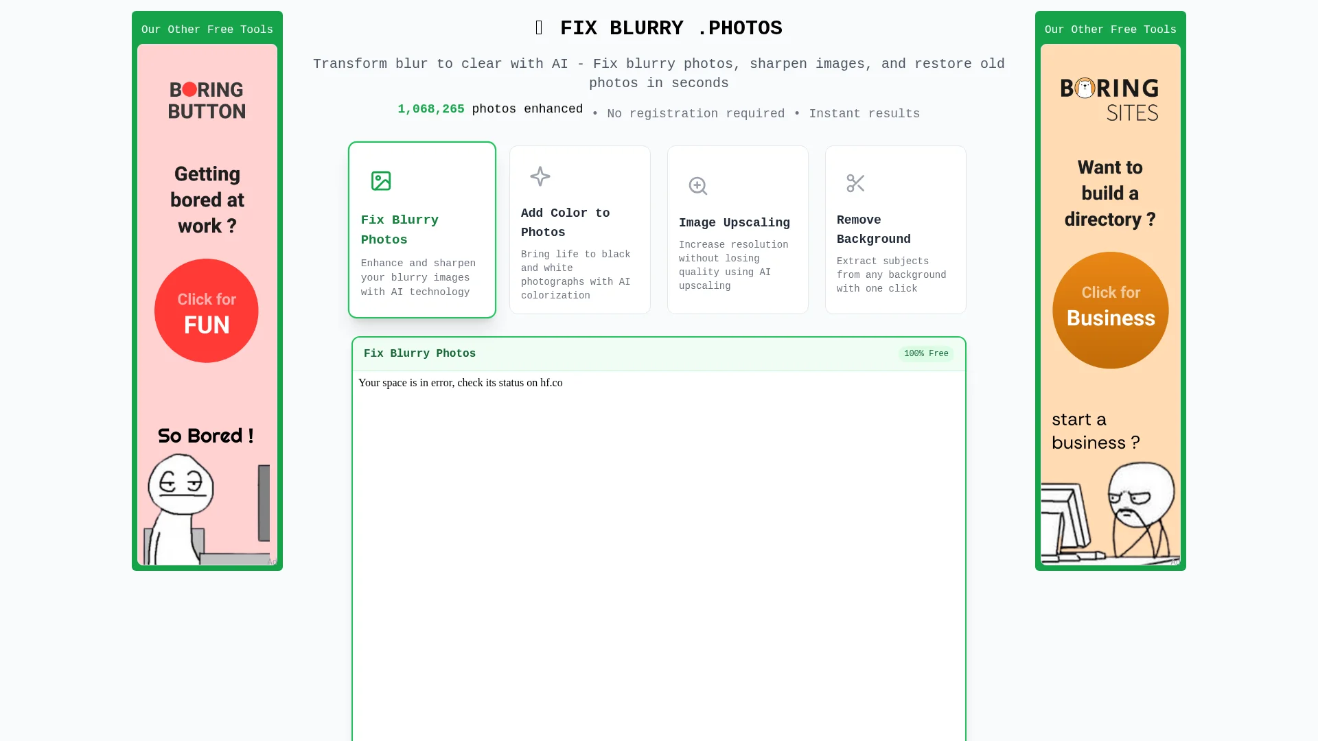 About Fixblurry.Photos : Fixblurry.Photos is a free, online AI tool that specializes in restoring and sharpening blurry photos, unblurring images, and revitalizing old photos to their original clarity. With a focus on simplicity and effectiveness, the platform requires no registration and offers instant results within a single click.