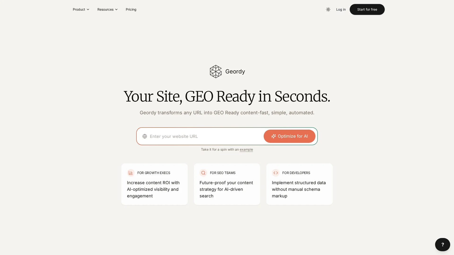 About Geordy Ai : Geordy AI is a generative engine that optimizes content for AI-driven search by automating structured data generation.