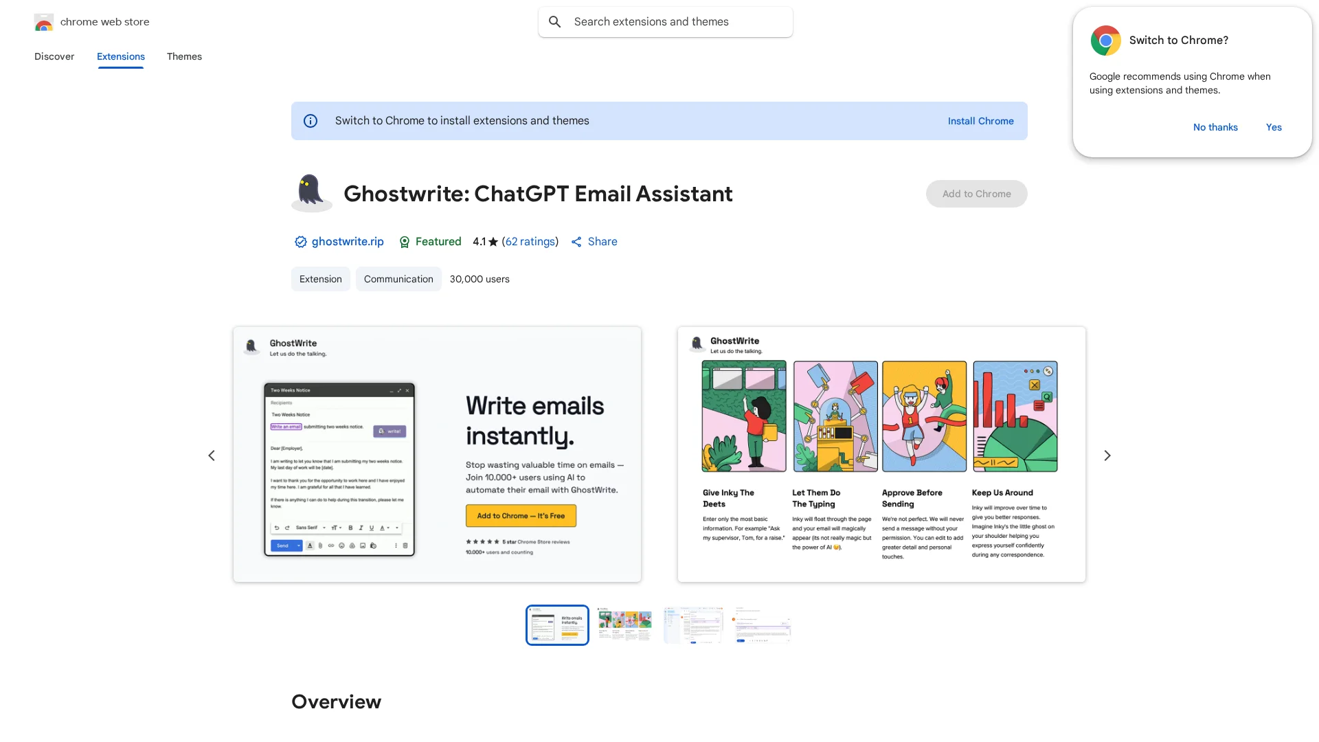 About Ghostwrite : An AI-powered email writing assistant integrated with ChatGPT to help you craft professional emails effortlessly.link: https://chrome.google.com/webstore/detail/ghostwrite-ai-email-assis/fapdnlkohpmnlgfjblcpggkcpaehdpobcta: Get it on Chrome Web Store