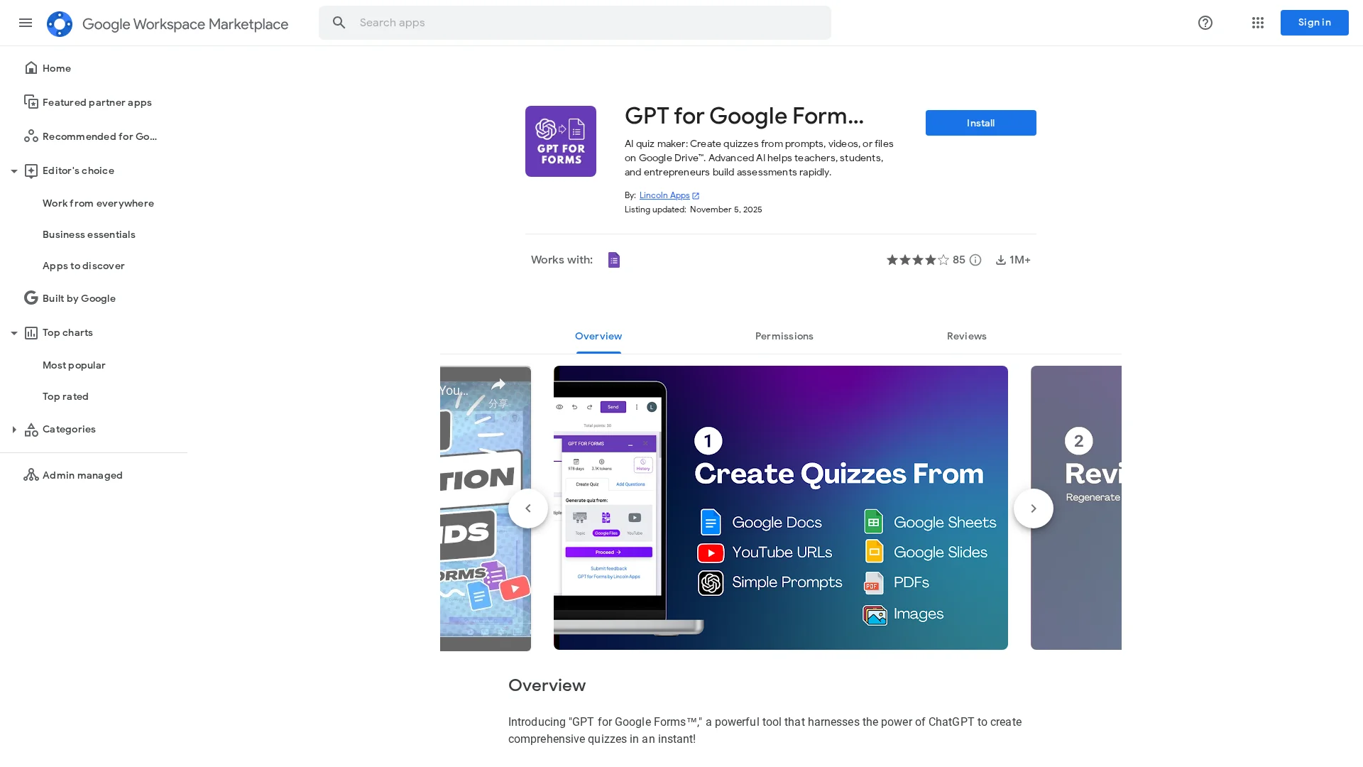 About Gpt For Google Forms : Gpt For Google Forms is an AI quiz maker that uses advanced AI to help teachers, students, and entrepreneurs build assessments rapidly. It allows users to create quizzes from prompts, videos, or files on Google Drive.