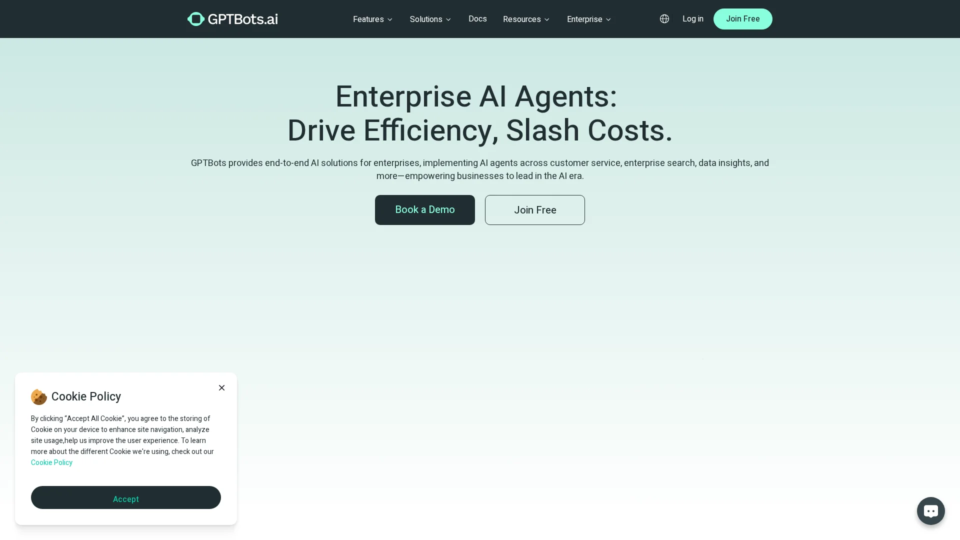 About Gptbots.Ai : Gptbots.Ai Enterprise AI Agents deliver 50% faster resolution and 70% cost reduction with a turn-key implementation including system integration, staff training, and performance optimization.