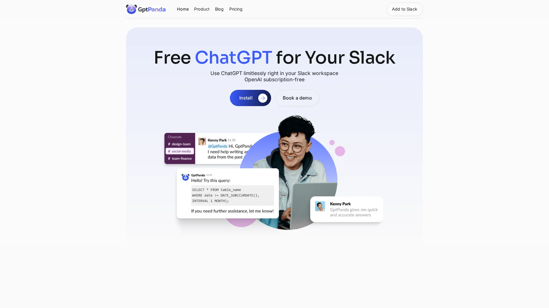 About Gptpanda : Gptpanda Free ChatGPT for Slack is a free AI assistant for your Slack workspace. It uses the latest ChatGPT 4.0 model for limitless free access, enhancing data and creative brainstorming in your workspace. This AI tool streamlines productivity and helps with content generation, analysis, automation, and more.