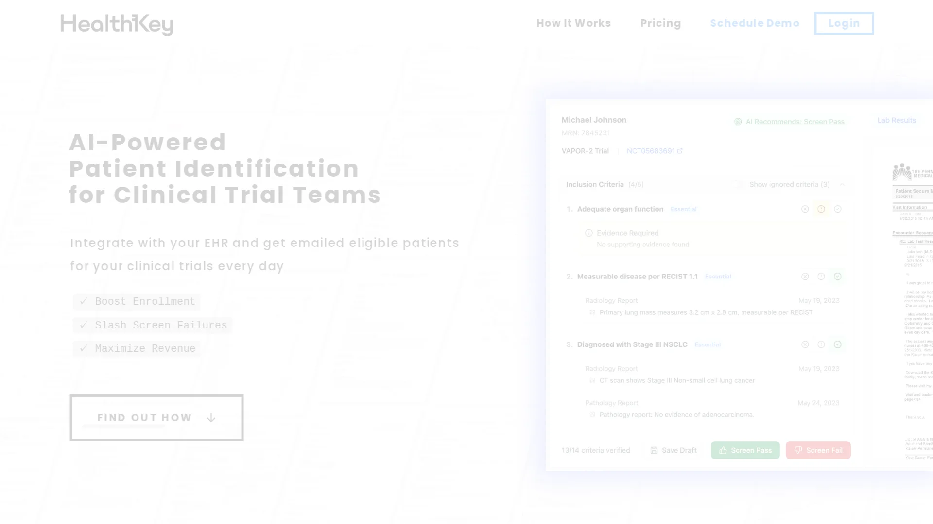 About Healthkey : HealthKey Boost Clinical Trial Enrollment uses AI-powered Patient Identification to match trials' eligibility criteria with patient's EHR data, minimizing chart review and maximizing enrollment.