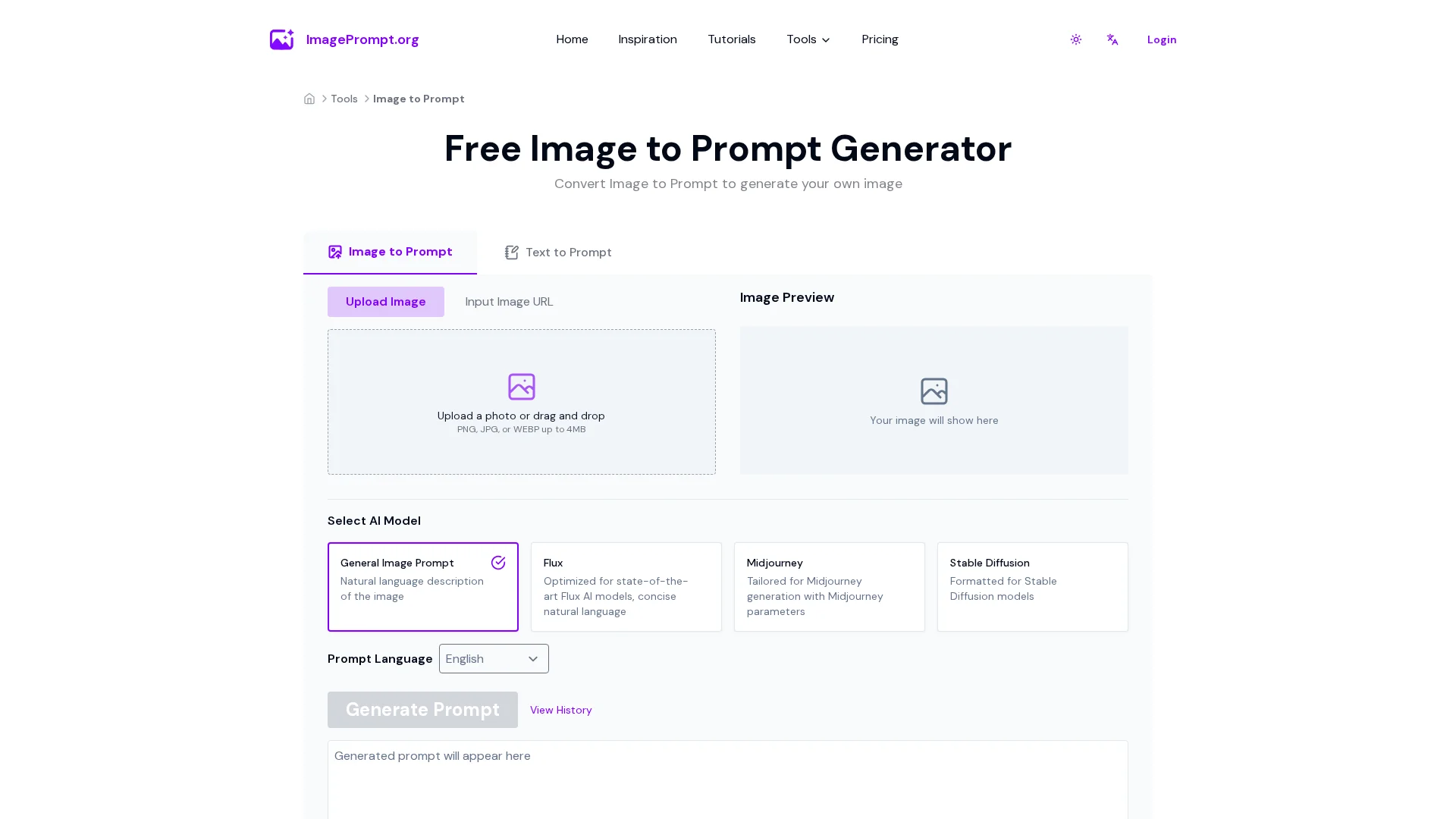 Easily generate prompt from image using our Image to Prompt Generator. Create detailed image prompt for Midjourney, Flux, Stable Diffusion and other models.