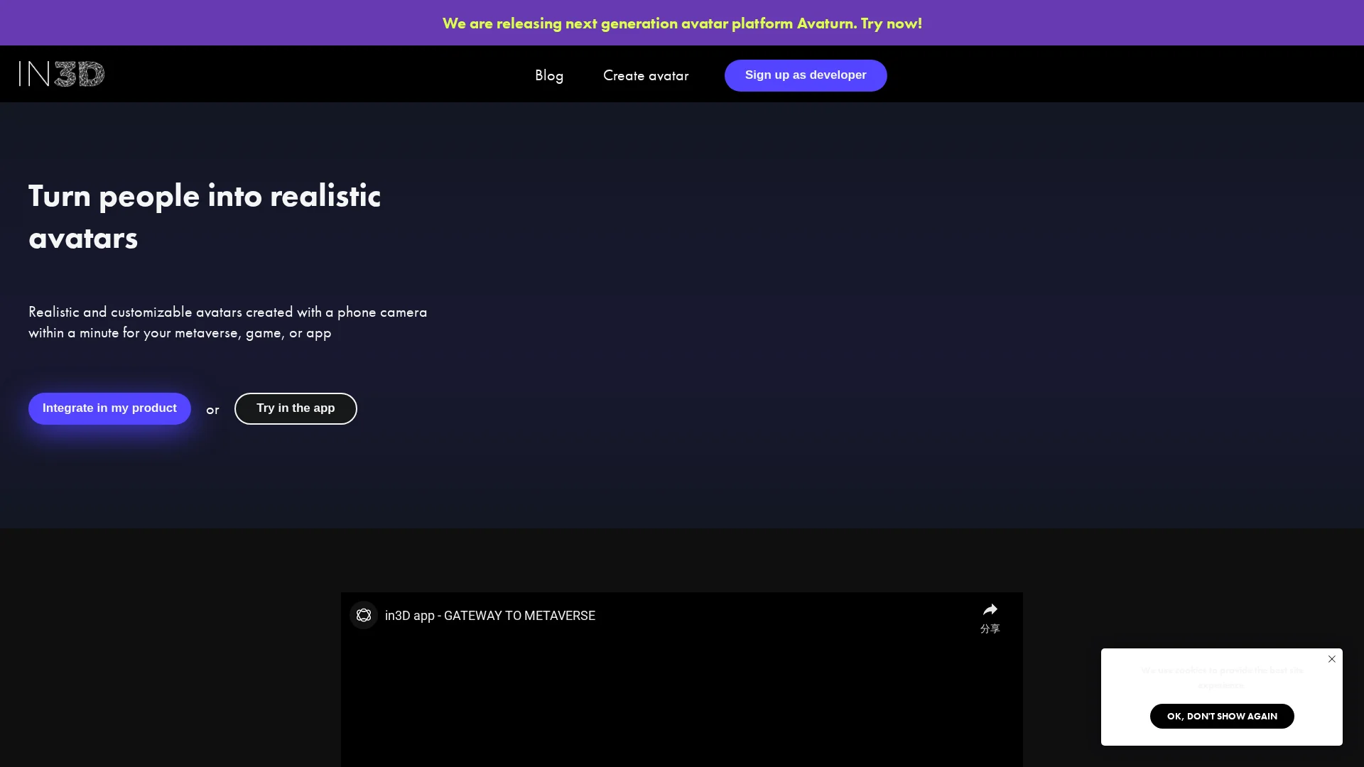 About In3D : in3D is a cutting-edge technology that transforms people into realistic full-body 3D avatars within a minute using just a phone camera. Our SDK enables seamless integration of in3D avatars into your product.