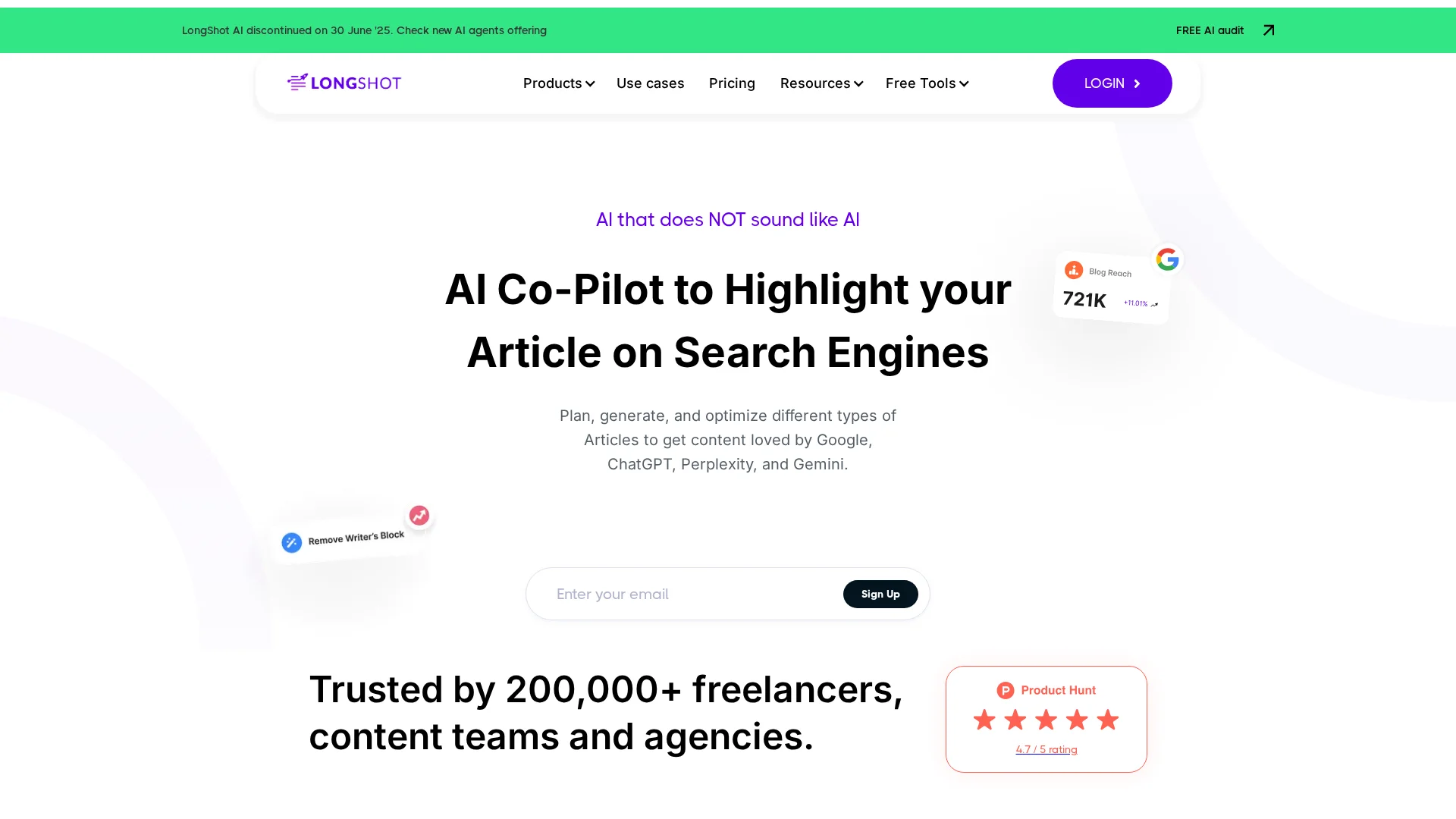 About Longshot : LongShot AI Co-Pilot is an article writing and optimization tool that helps create content that ranks on search engines like Google, ChatGPT, Perplexity, and Gemini. It's an all-in-one platform for planning, generating, and optimizing article content.