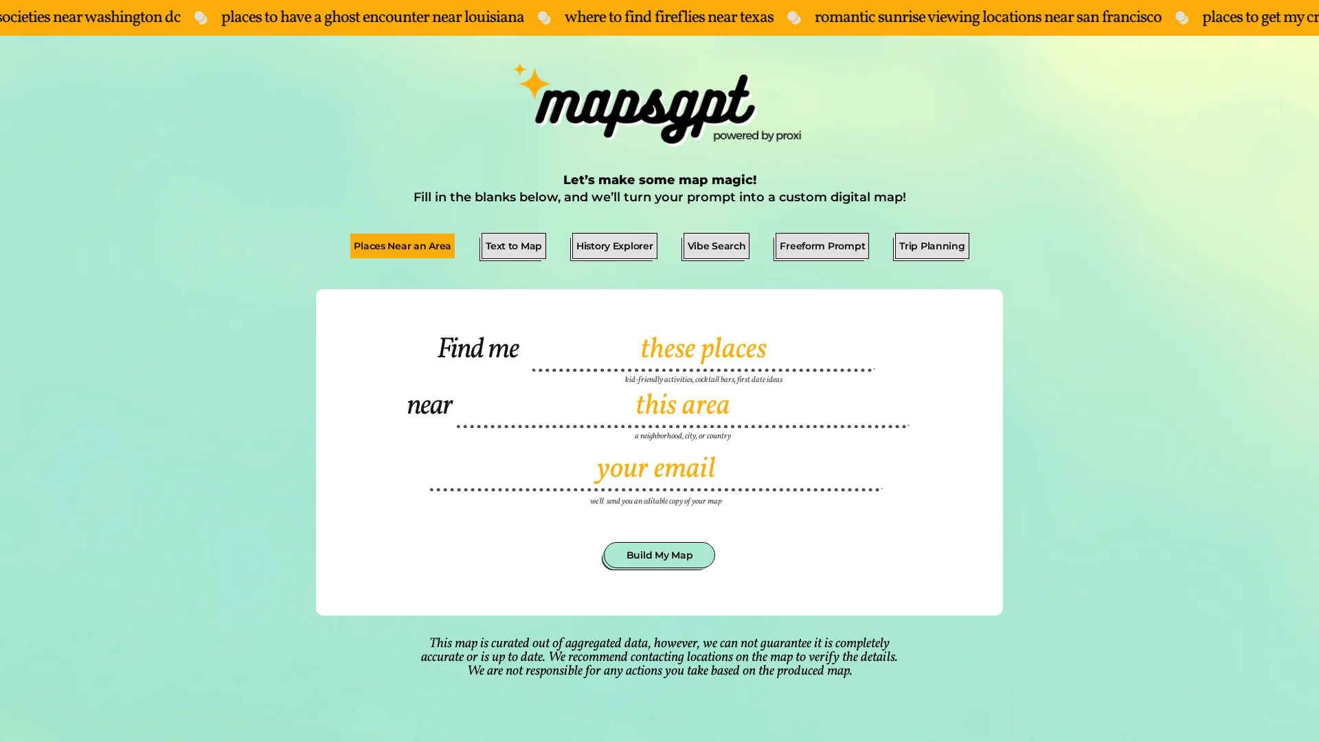 Looking for the best flea markets, date nights, sexiest bridges in north america, or spots or perfect parks for walking your cat? Our map generator, powered by OpenAI and Proxi, will make a map with custom pins in seconds. Give it a try!