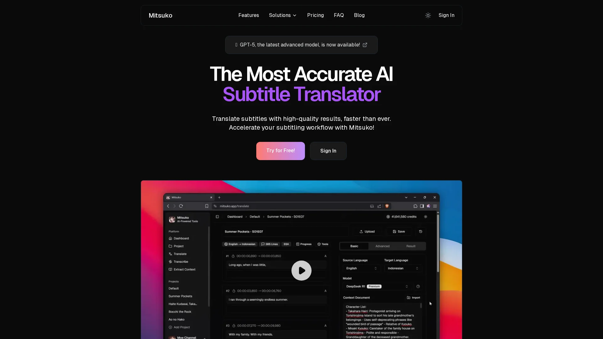 About Mitsuko : Mitsuko Mitsuko is an AI-powered subtitle translator that delivers high-quality, natural, and context-aware translations in over 100 languages.