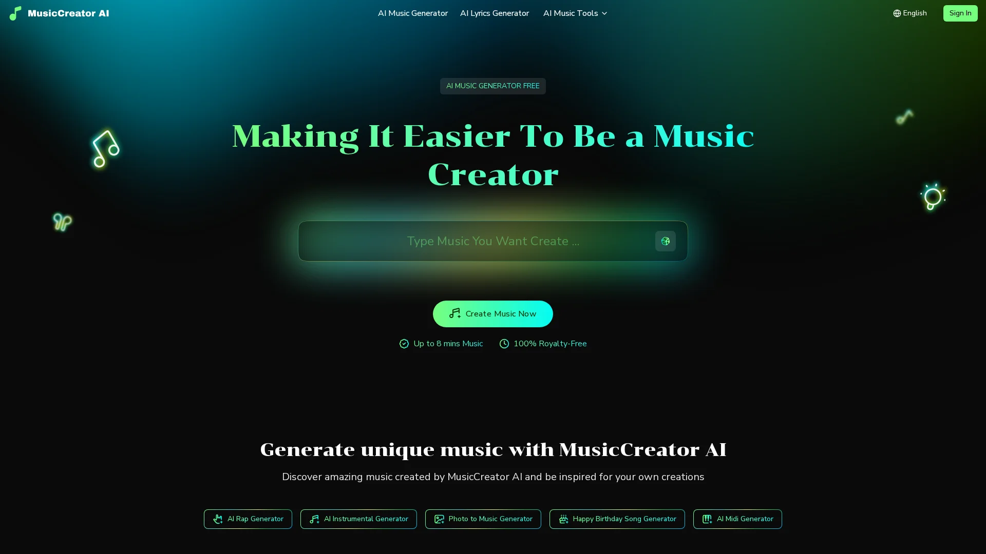 Create unlimited royalty-free music with MusicCreator AI. Generate unique songs in seconds using AI technology. Perfect for videos, podcasts, and projects. Try free now!
