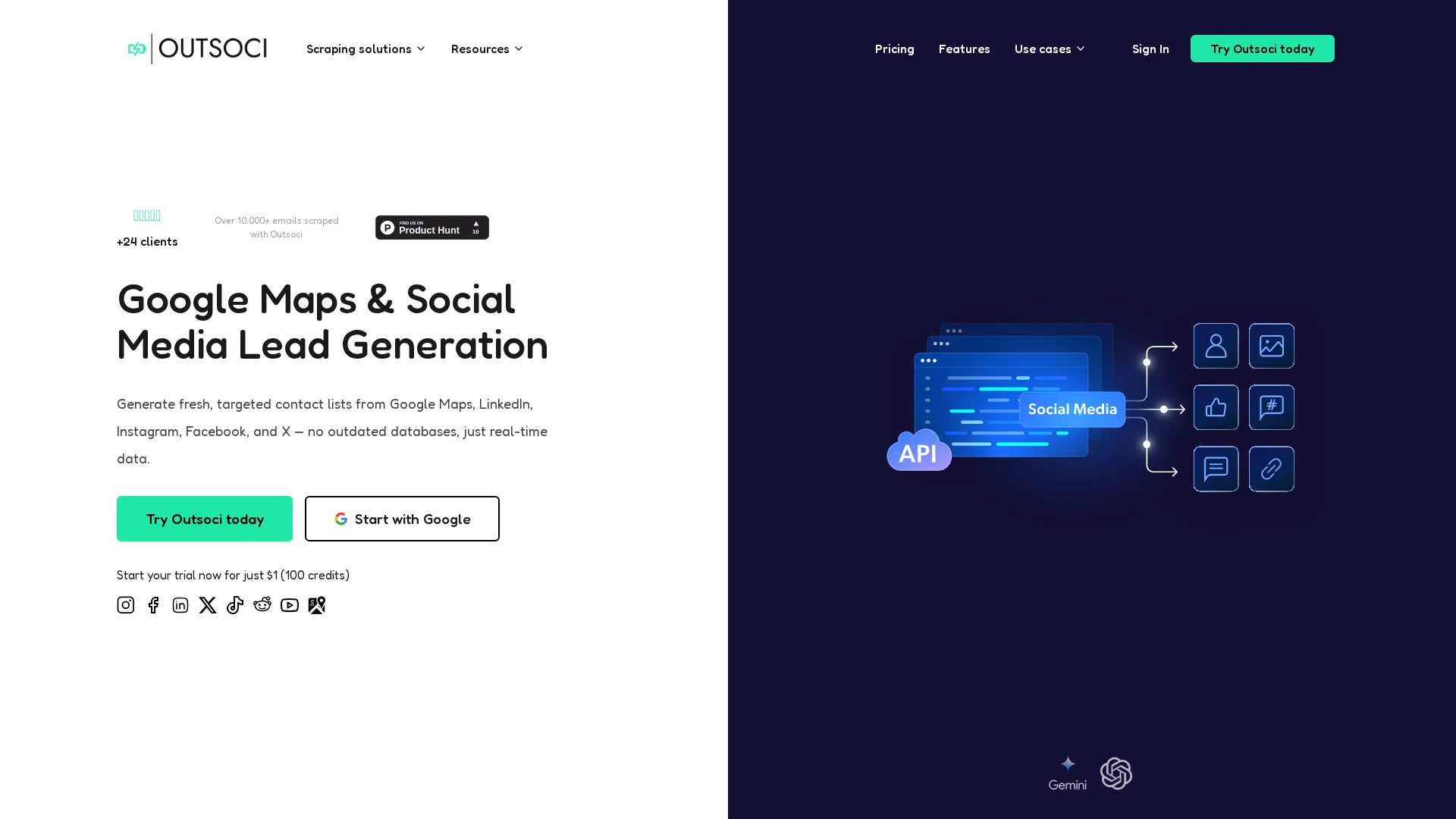 Outsoci is the ultimate lead generation tool for businesses and agencies. Legally scrape and collect emails from Facebook, Instagram, TikTok, LinkedIn, YouTube, Google Maps, Reddit, and ProductHunt. Export leads to CSV/XLS. Powered by Serper for compliance and accuracy.