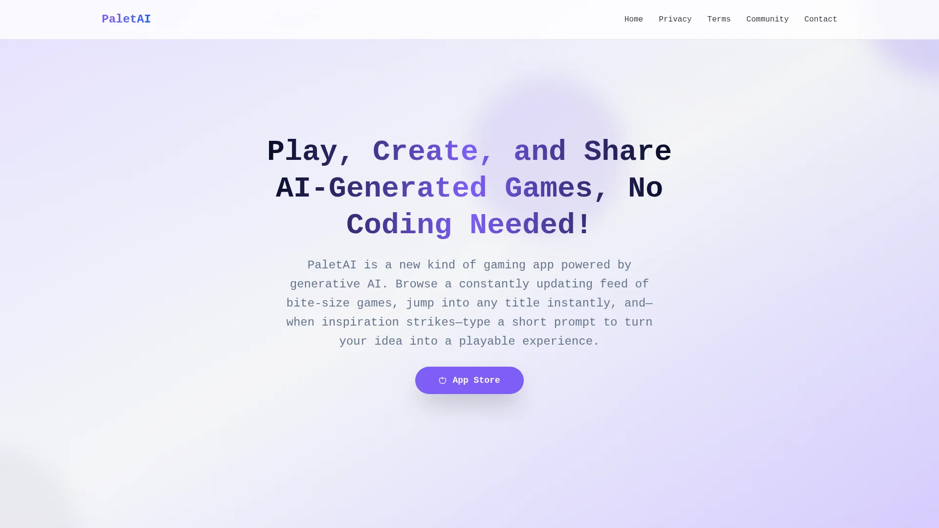 PaletAI is a generative AI-powered gaming app. Play fresh, bite-size games or create your own in seconds—no coding needed. Just type a prompt and start playing.