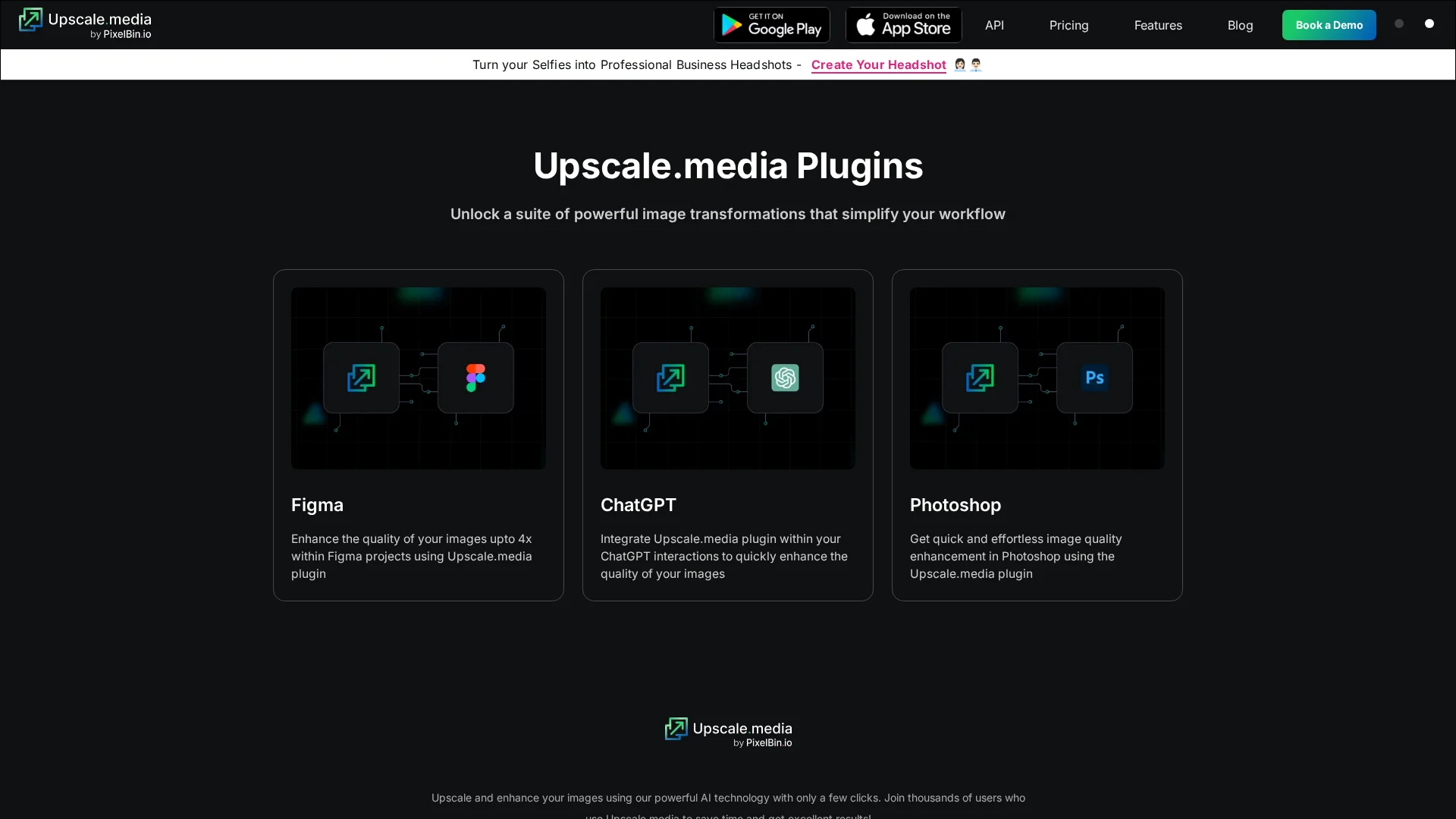 About Plugins By Upscale.Media : Upscale.media plugins simplify image editing across platforms, from Figma to ChatGPT to Photoshop, enhancing designs and conversations effortlessly.