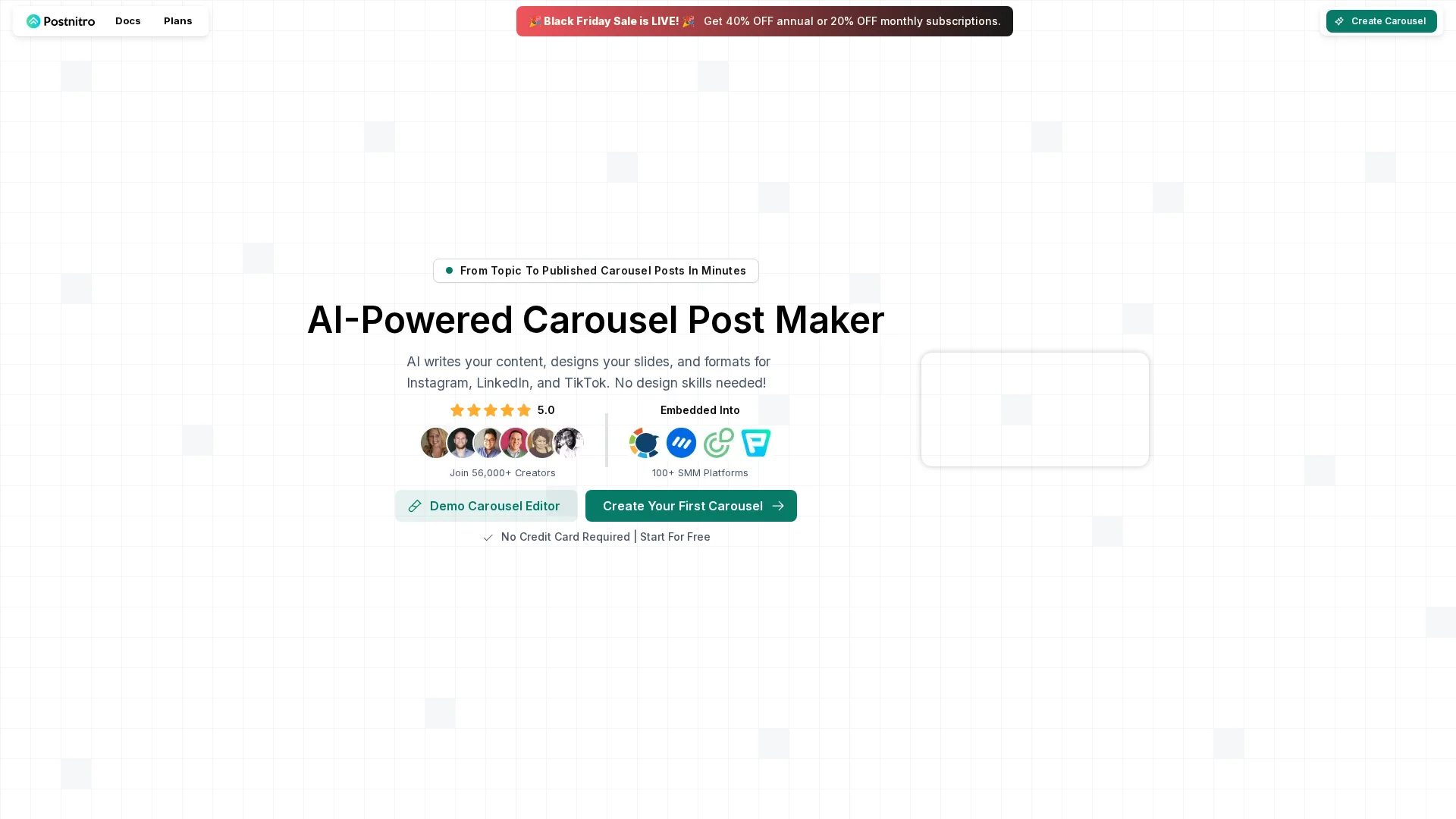 PostNitro is an AI-powered carousel maker that creates visually captivating carousels for Instagram, LinkedIn, and more to drive social engagement and growth.