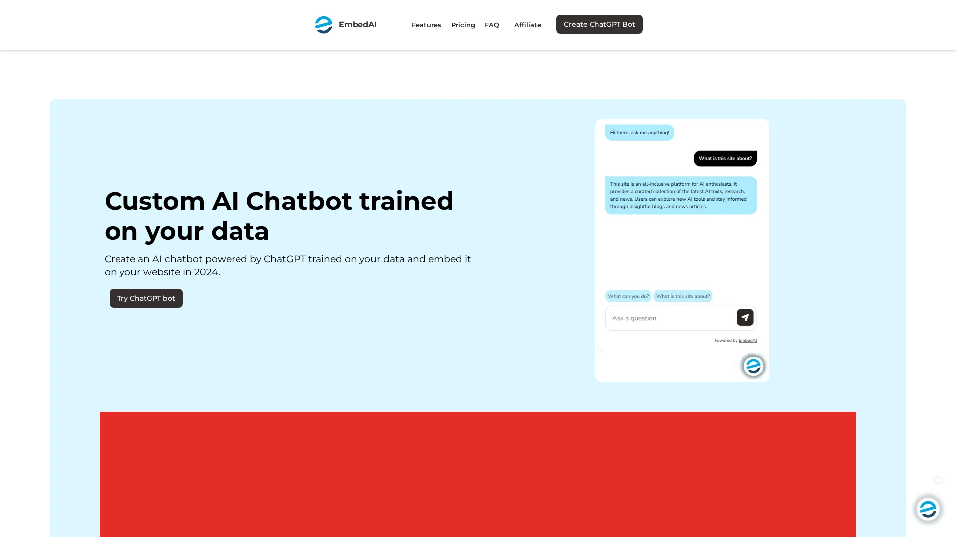 EmbedAI is a platform that enables users to create AI chatbots powered by ChatGPT using their data. An all in one AI chatbot builder in 2024.