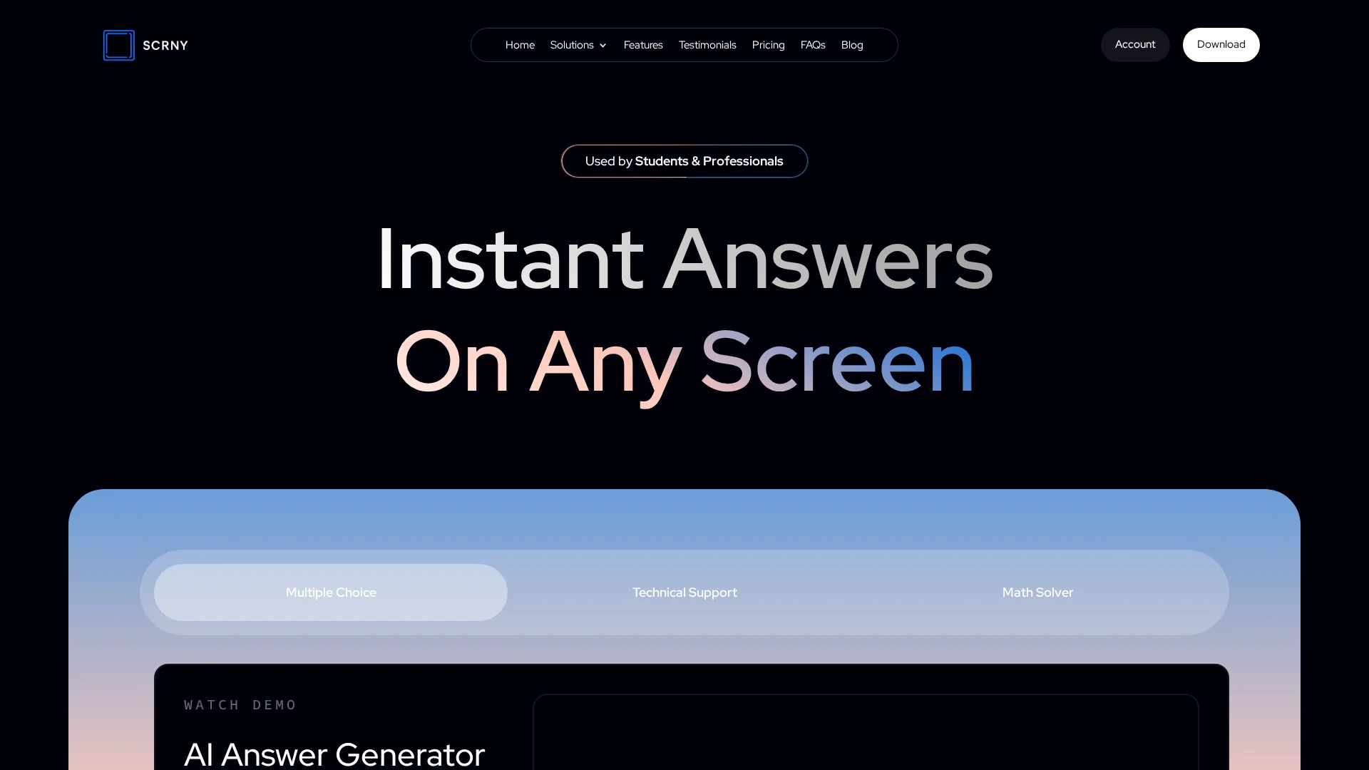 About Scrny : Scrny Scrny is an instant AI answer generator and problem solver that provides accurate answers in under 3 seconds. It utilizes AI technology to analyze and provide solutions to questions.