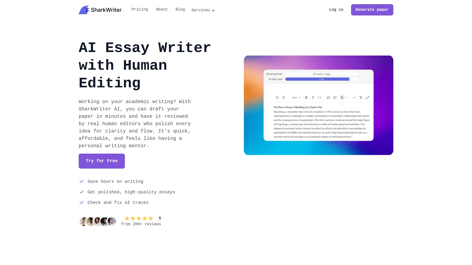 About Sharkwriter.Ai : SharkWriter.AI is an AI-powered essay writing and human editing tool designed for students. It provides fast, original, and tailored essays to academic standards.