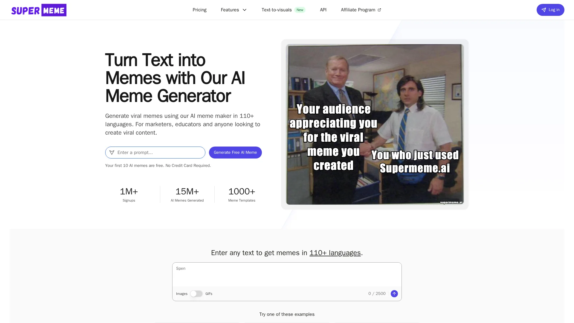 About Supermeme : Create hilarious memes from text using our AI-powered meme generator. Supported in 110+ languages, with GIFs and multi-panel memes.
