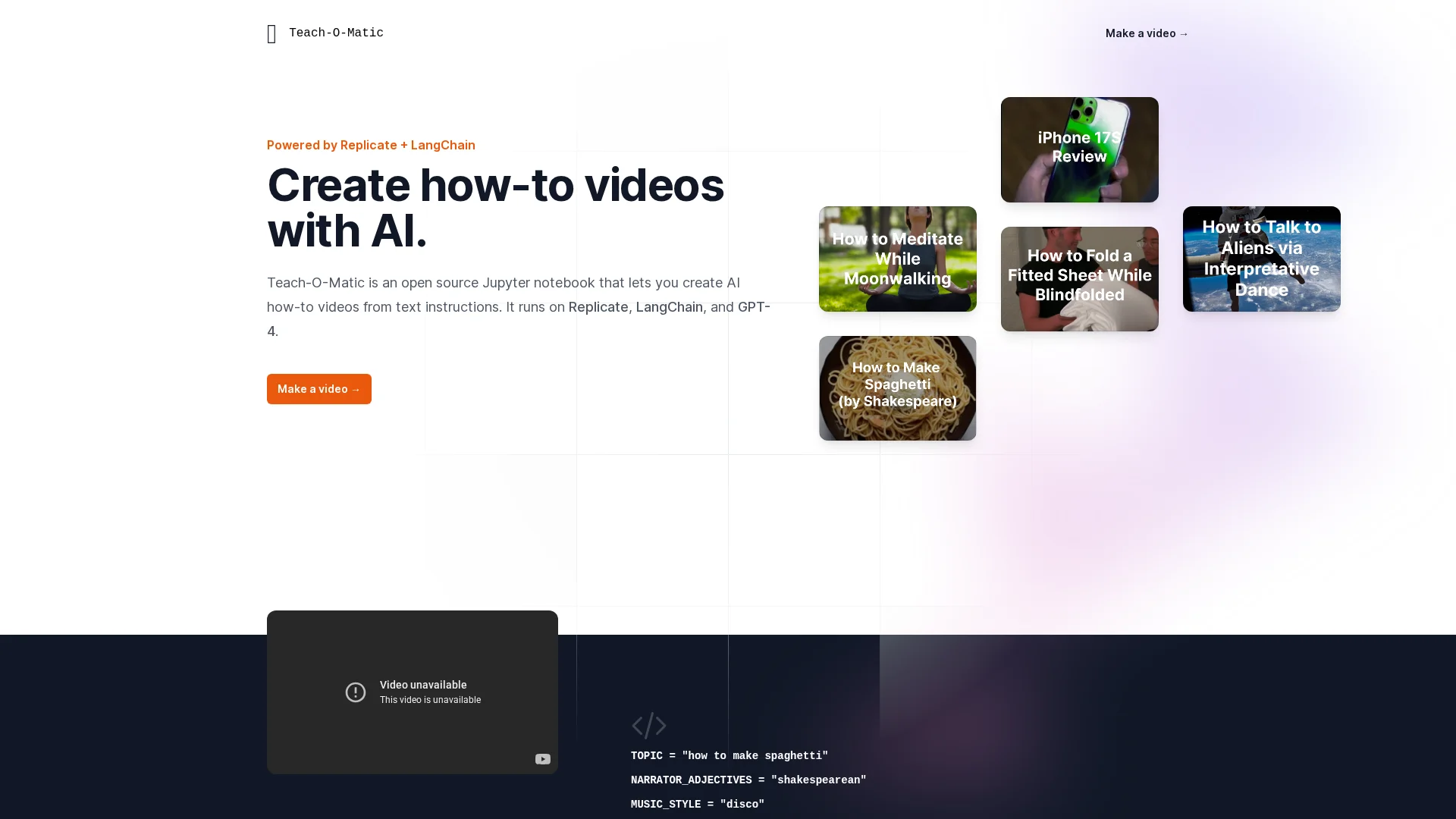About Teach-O-Matic : Teach-O-Matic utilizes AI to generate step-by-step instructional videos by replicating the user's knowledge and incorporating LangChain's ability to link related concepts.