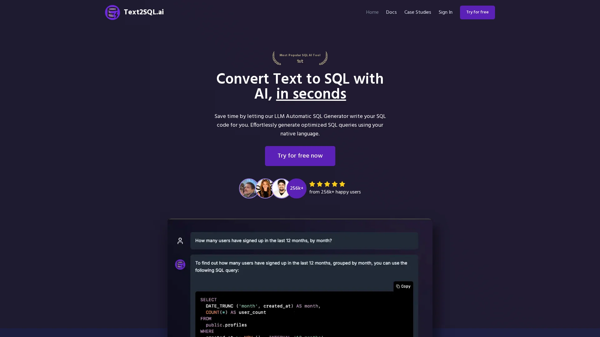 Generate SQL queries in seconds with our intuitive AI-powered tool.
