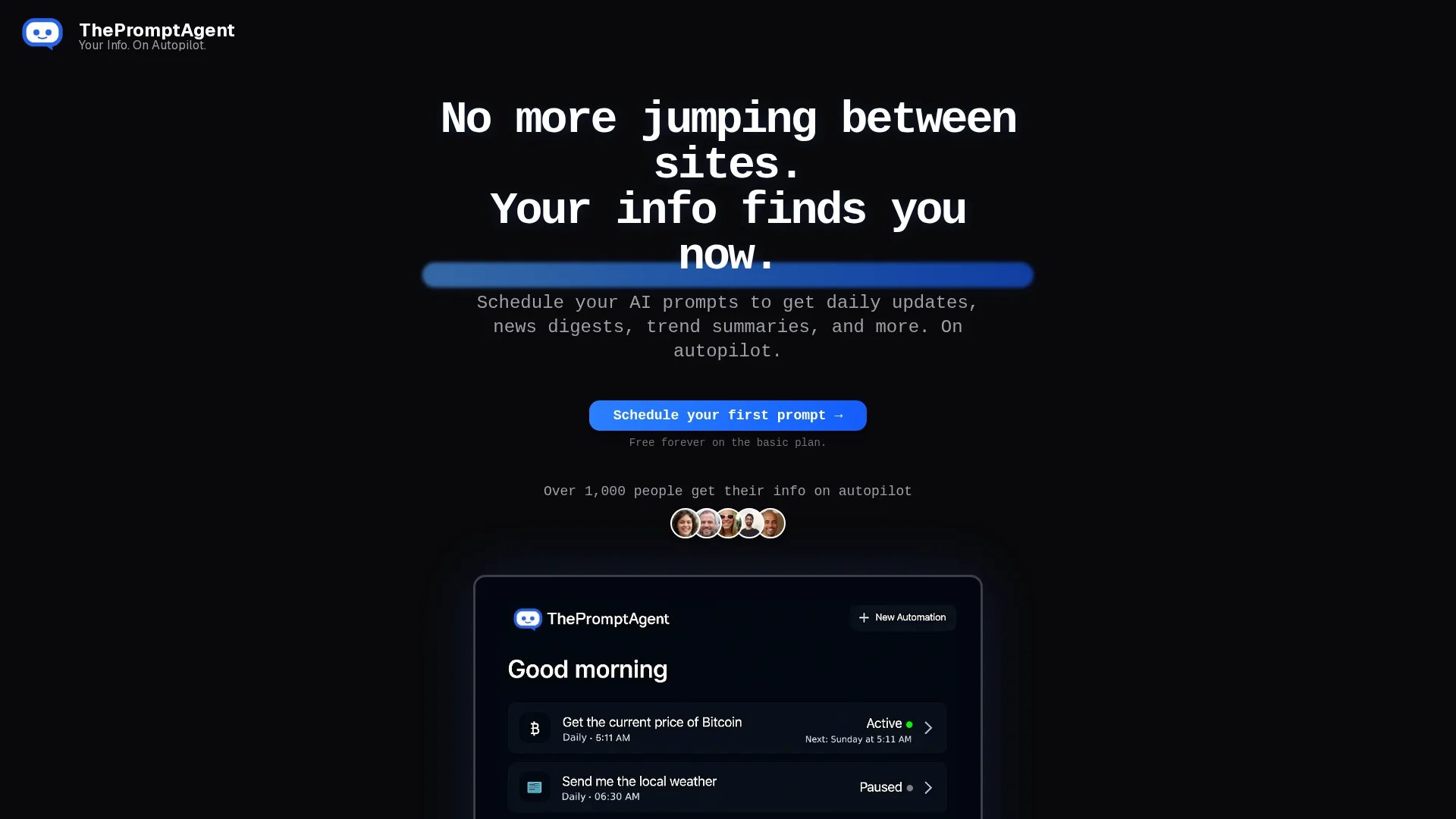 About Thepromptagent : Schedule your AI prompts to receive daily updates, news digests, trend summaries, and more.