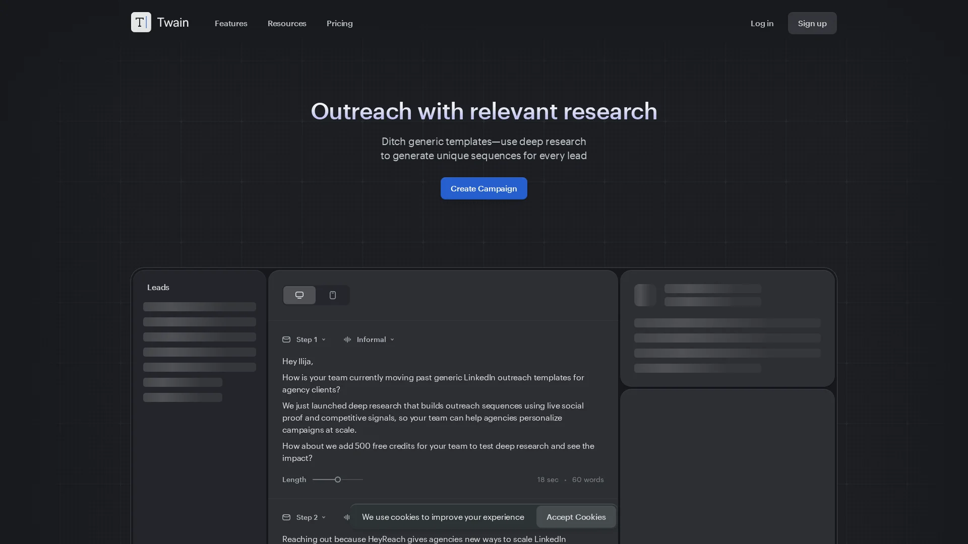 About Usetwain : Usetwain Twain is an AI-based outreach tool that uses deep research to generate unique sequences for every lead, ditching generic templates.