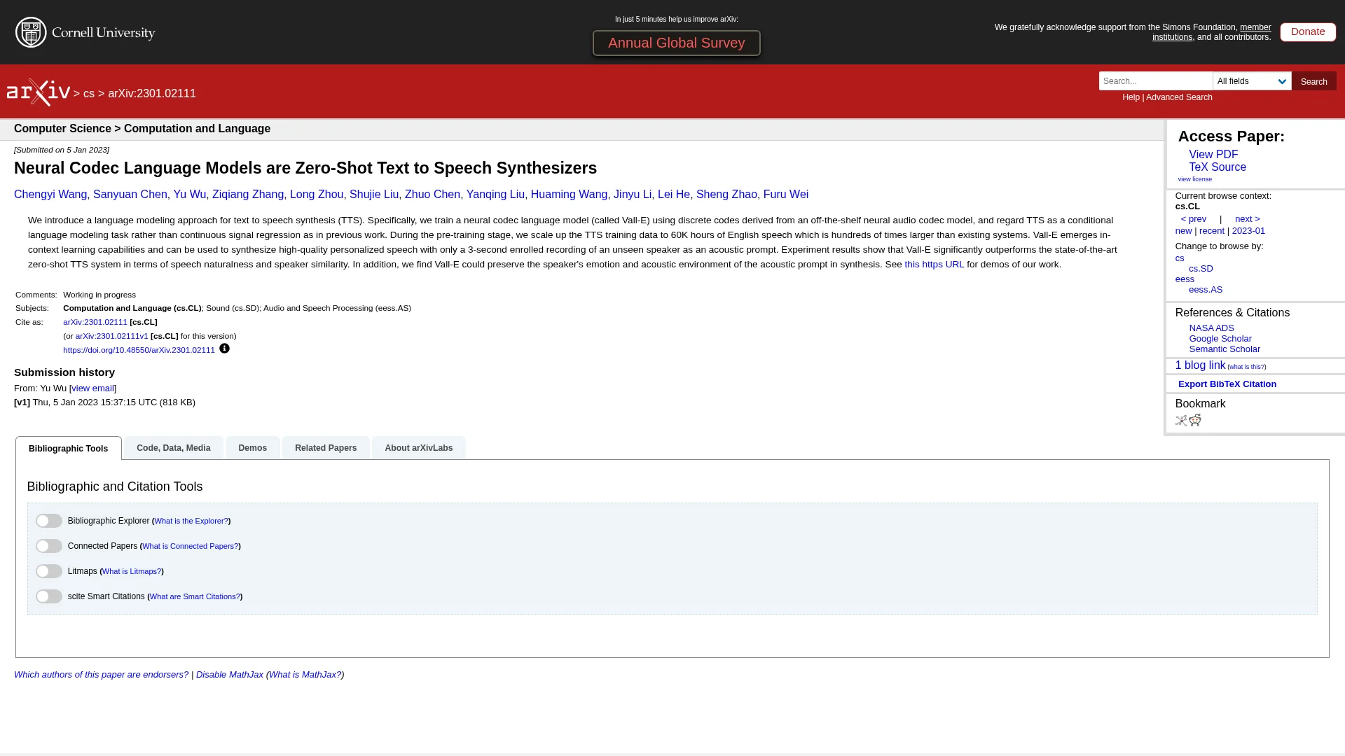 Abstract page for arXiv paper 2301.02111: Neural Codec Language Models are Zero-Shot Text to Speech Synthesizers