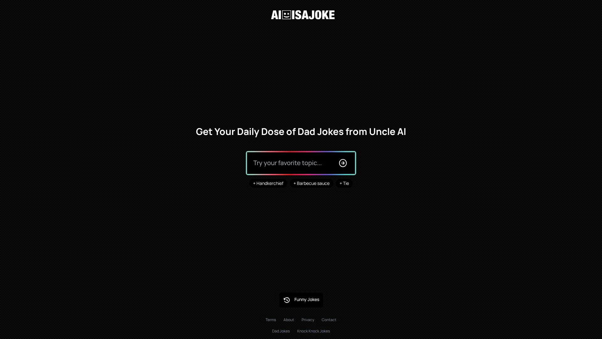 About Ai Is A Joke : text: Meet Uncle A.I., your go-to destination for generating hilarious dad jokes and puns. Our AI-powered tool is designed to bring laughter to all ages and occasions, making it perfect for families, parties, and everyday humor breaks.logo: None