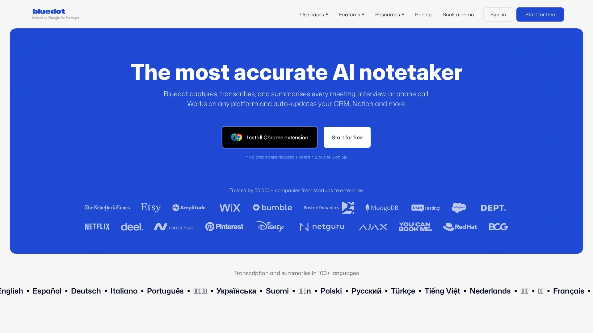 About Bluedot : intro: Bluedot is an AI-powered note-taker that effortlessly captures and summarizes your meetings, making it easier to stay organized.content: It works across any platform, auto-updating your CRM without manual input, ensuring seamless collaboration and productivity.