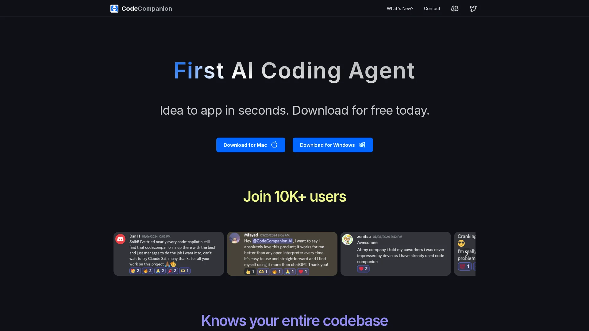 Meet CodeCompanion.AI â your personal coding assistant, available anytime, right on your desktop.nPrototype faster, code smarter, enhance learning and scale your productivity with the power of AI.