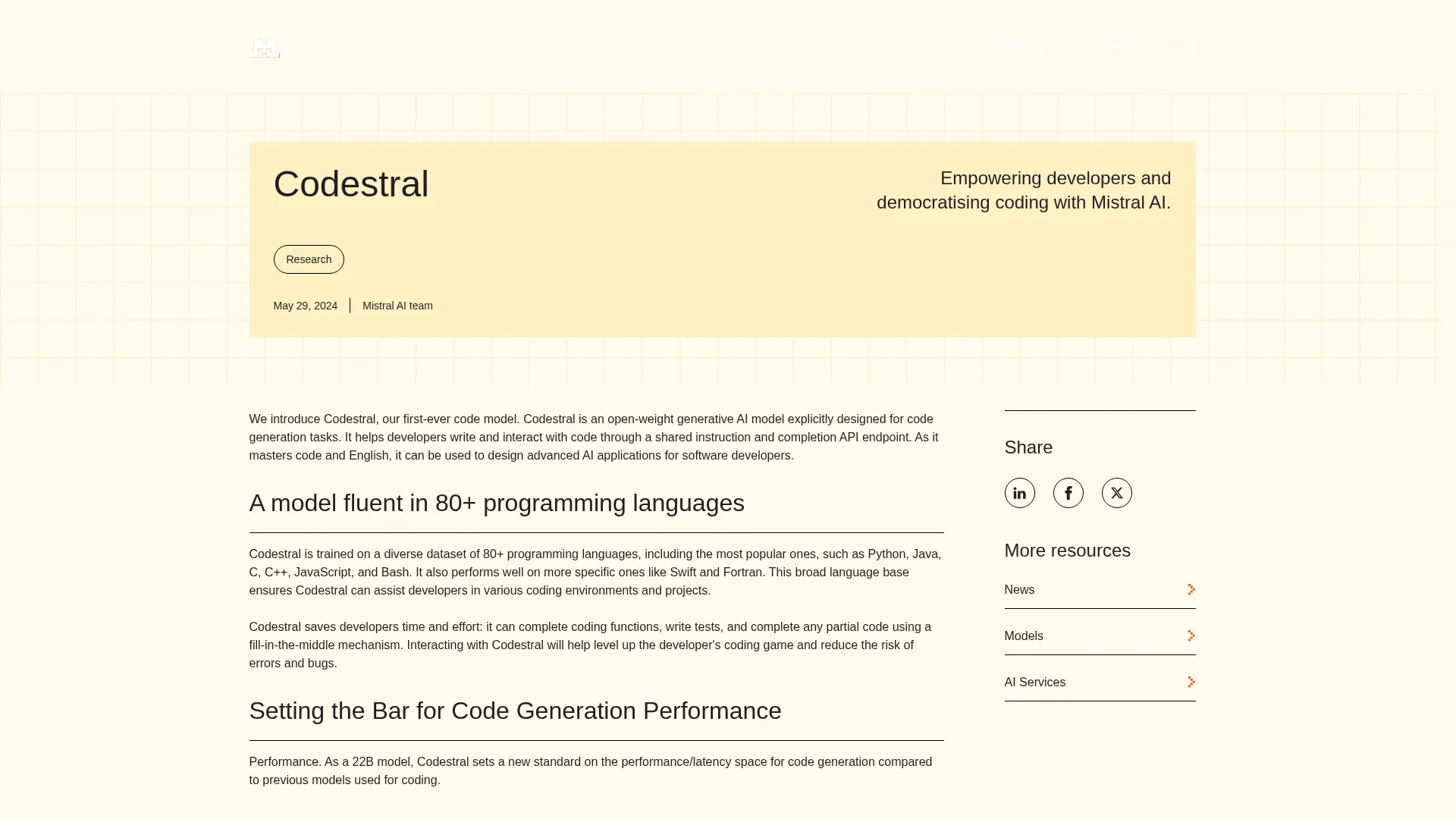 About Codestral : Mistral AI empowers developers by democratizing coding and providing a platform for innovative solutions.