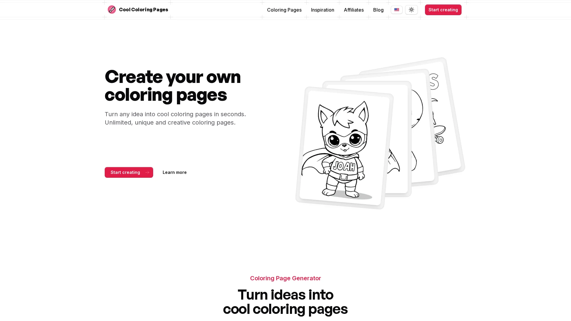 About Cool Coloring Pages : Cool Coloring Pages generates cool and creative coloring pages using AI. Turn any idea into a colorful page in seconds. Unlimited printable coloring pages with no limits.