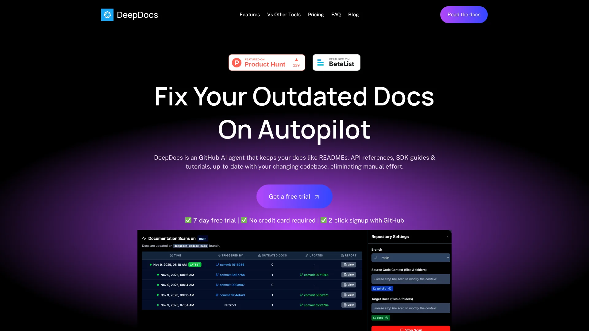 About Deepdocs : DeepDocs is an AI-powered tool designed to automate the updating of outdated GitHub documentation, saving users time and effort.