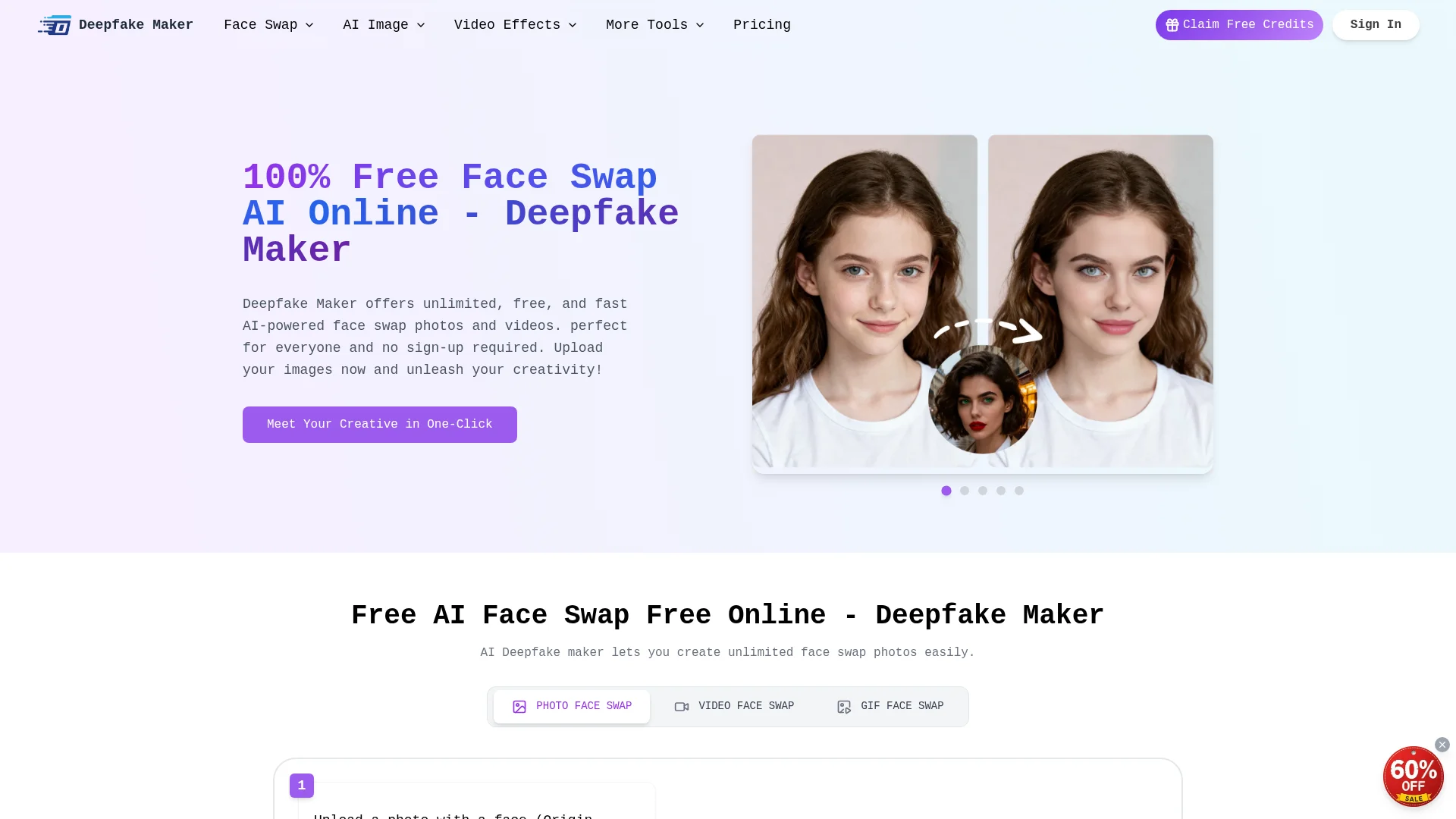 Deepfake Maker is an online AI face swap tool for photos and videos. It's easy to swap faces with our 100% free face swap AI. No Sign-up.