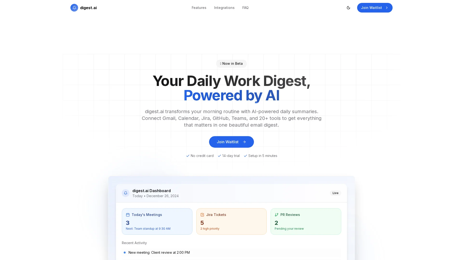 Transform your morning routine with digest.ai. Get AI-powered daily summaries of all your work notifications from Gmail, Slack, Jira, GitHub, and 20+ tools in one beautiful email digest.