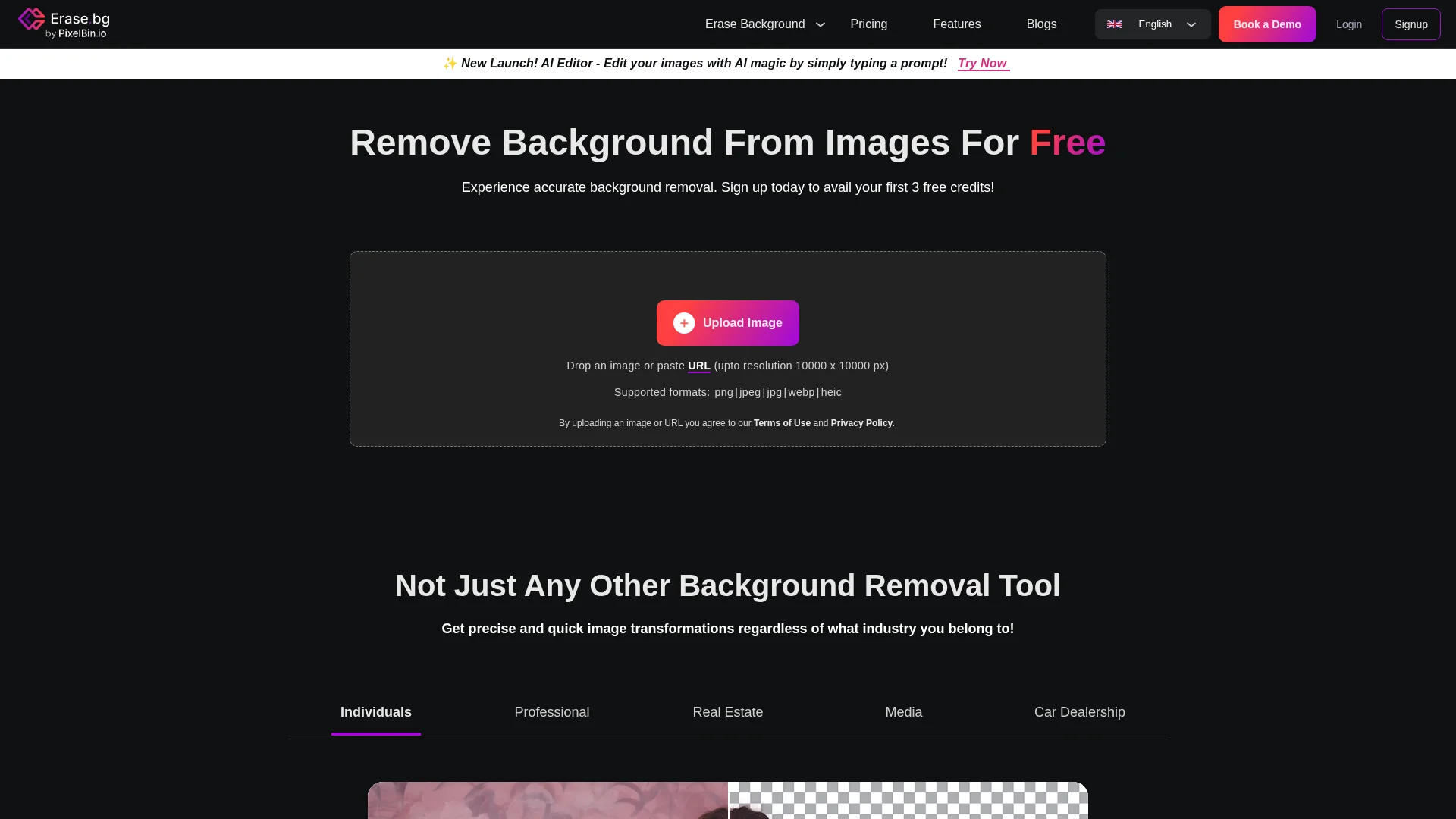 About Erase.Bg : Erase.bg is a free online tool that removes backgrounds from high-definition images of humans, animals, and objects. With no credit card required, users can download high-resolution images for e-commerce and personal use.