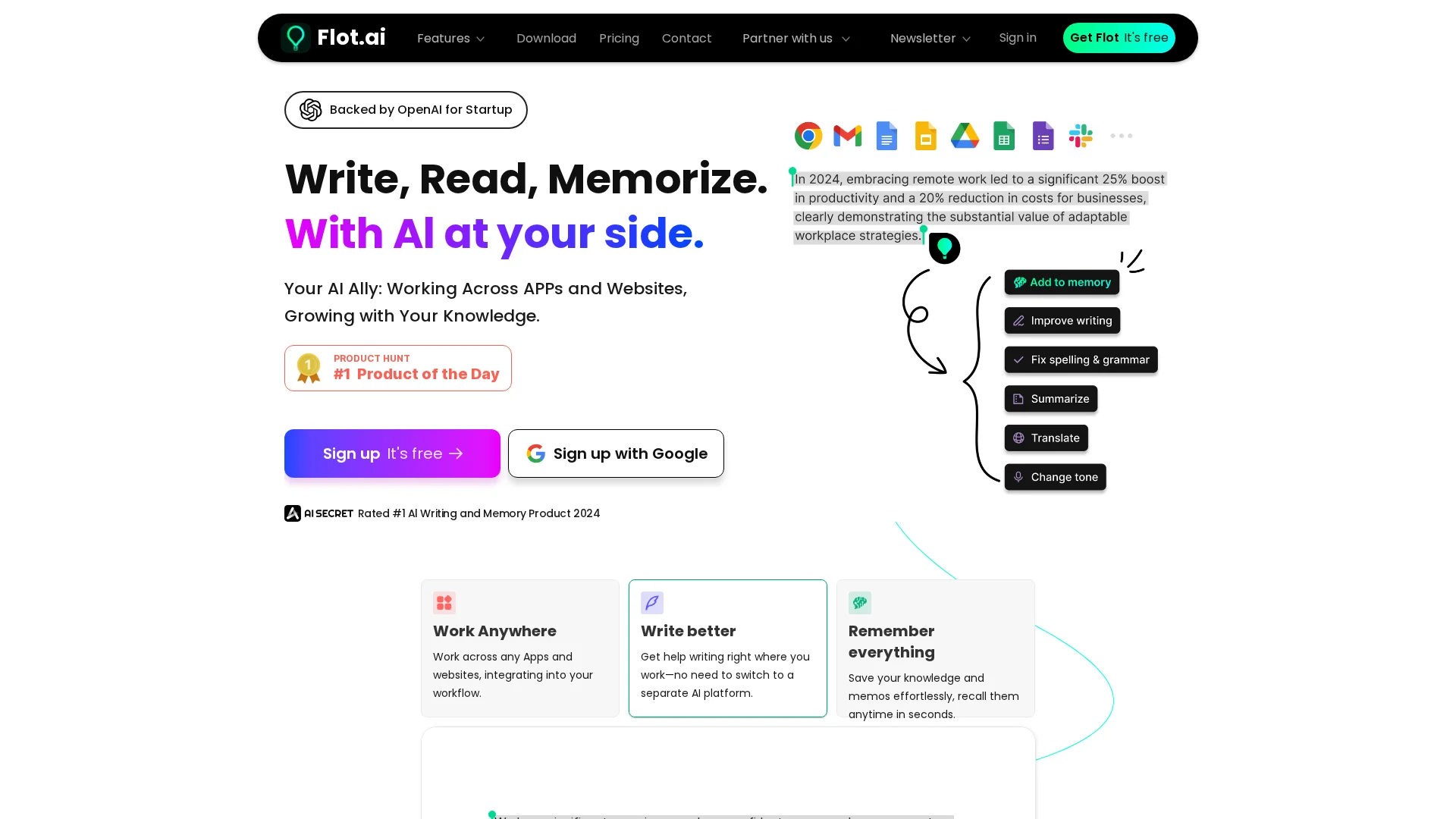 About Flot.Ai : Flot AI is your AI ally, designed to blend seamlessly into your workflow and grow with your knowledge. Leveraging our advanced AI capabilities, we empower users to write, read, and memorize with ease.