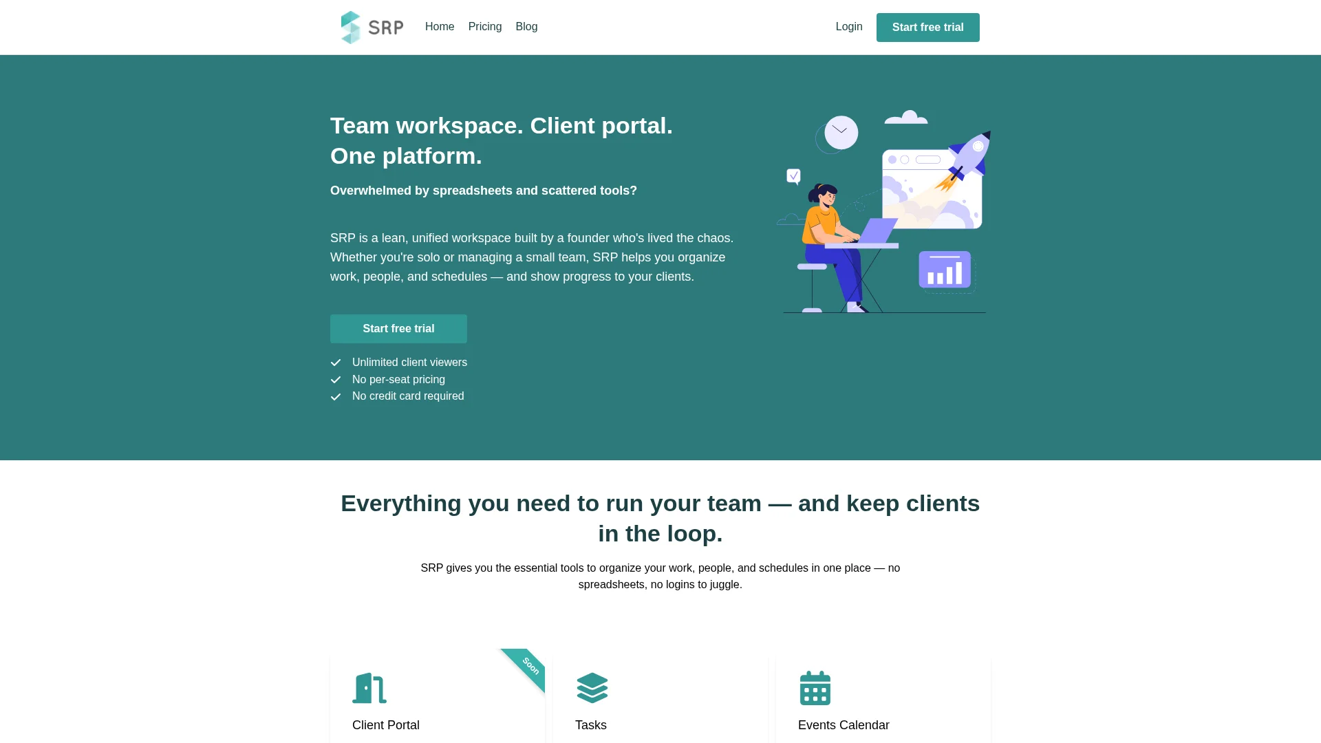 SRP gives agencies and small teams a shared workspace to plan work, plus a client portal that shows progress, files, and briefs — no more juggling spreadsheets, inboxes, and scattered tools.