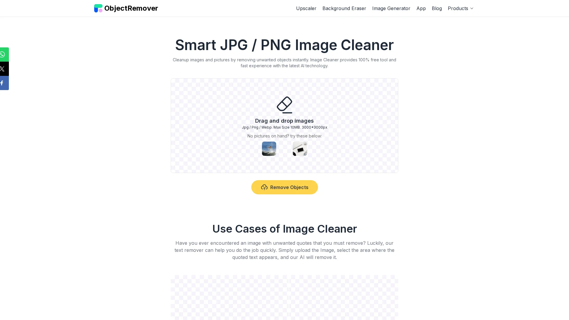 About Image Cleaner : Instantly clean up your images and pictures by removing unwanted objects with our smart JPG / PNG Image Cleaner.
