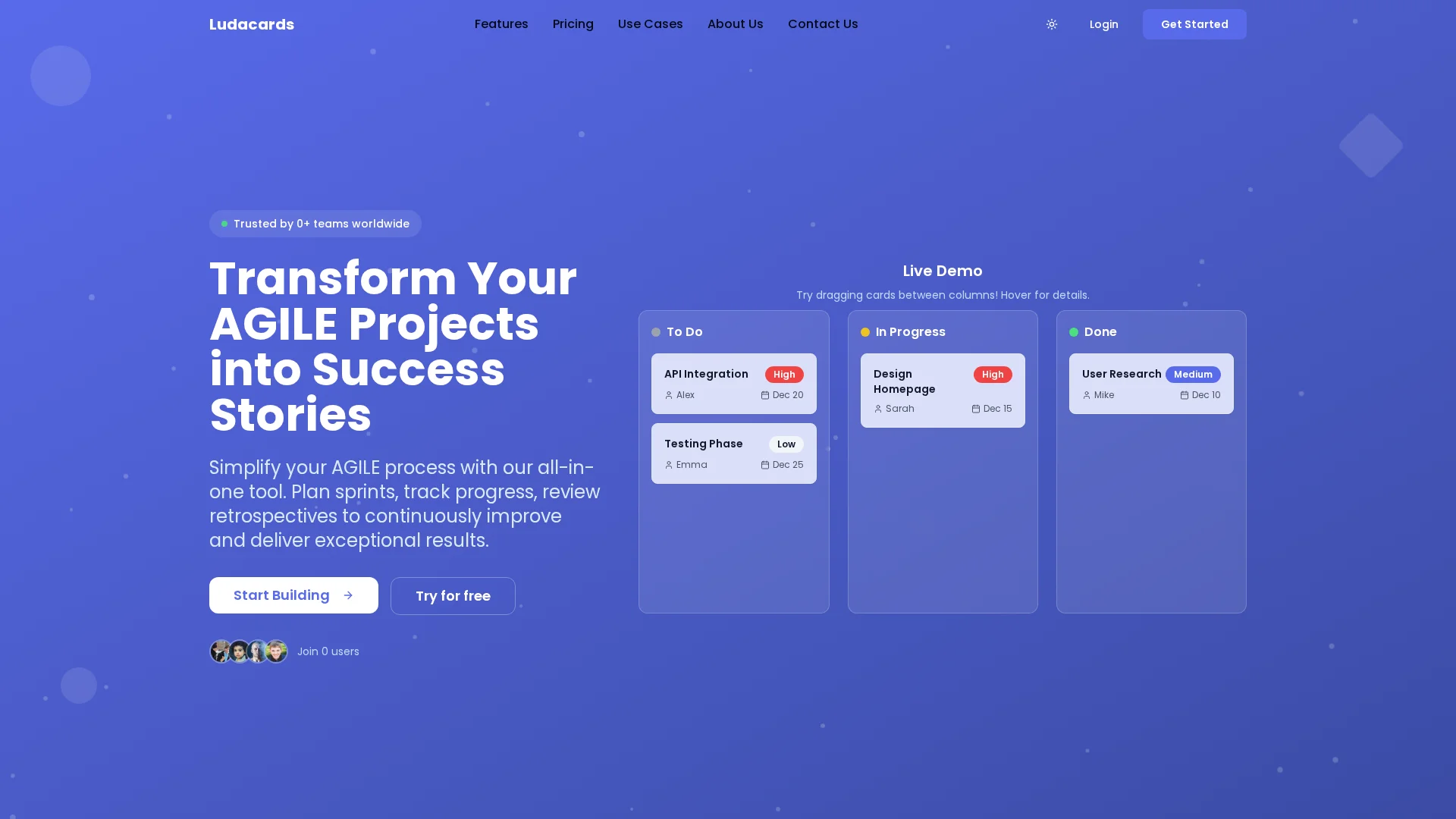 Empower your agile team with Ludacards. Plan sprints, manage tasks, and track workflows using intuitive boards, to-do lists, and checklists. Enhance collaboration, deliver faster, and streamline your projects. Try it for free!