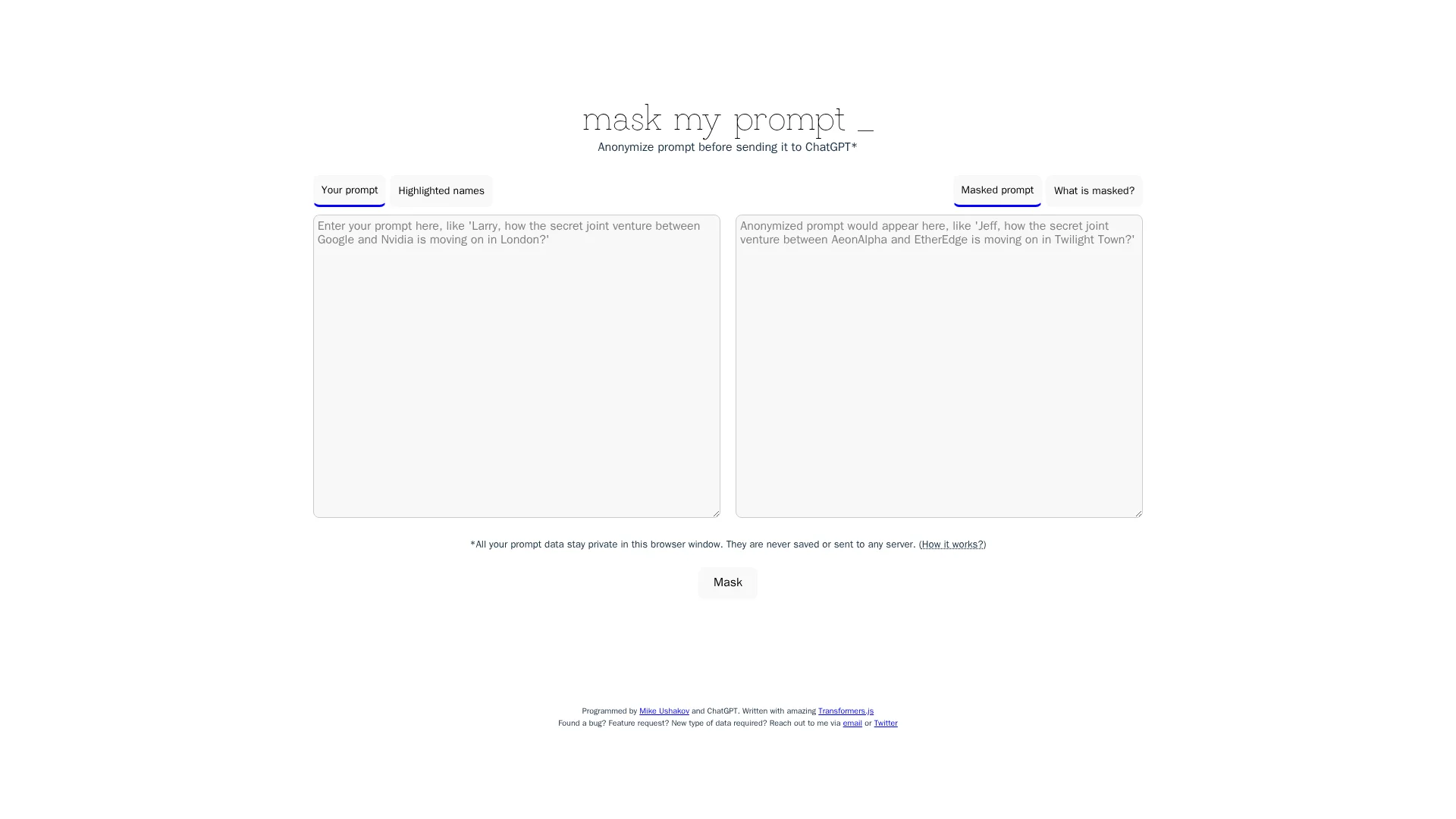 About Maskmyprompt : MaskMyPrompt anonymizes ChatGPT prompts to protect confidential data. It replaces names, organizations, and locations with fictional ones, giving you control over sensitive information.