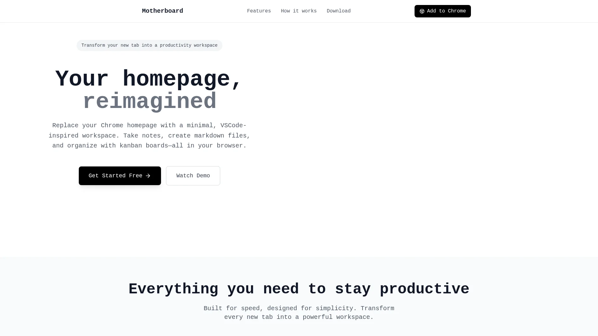 About Motherboard : A VSCode-inspired workspace in your browser for taking notes, creating markdown files, and organizing with kanban boards.